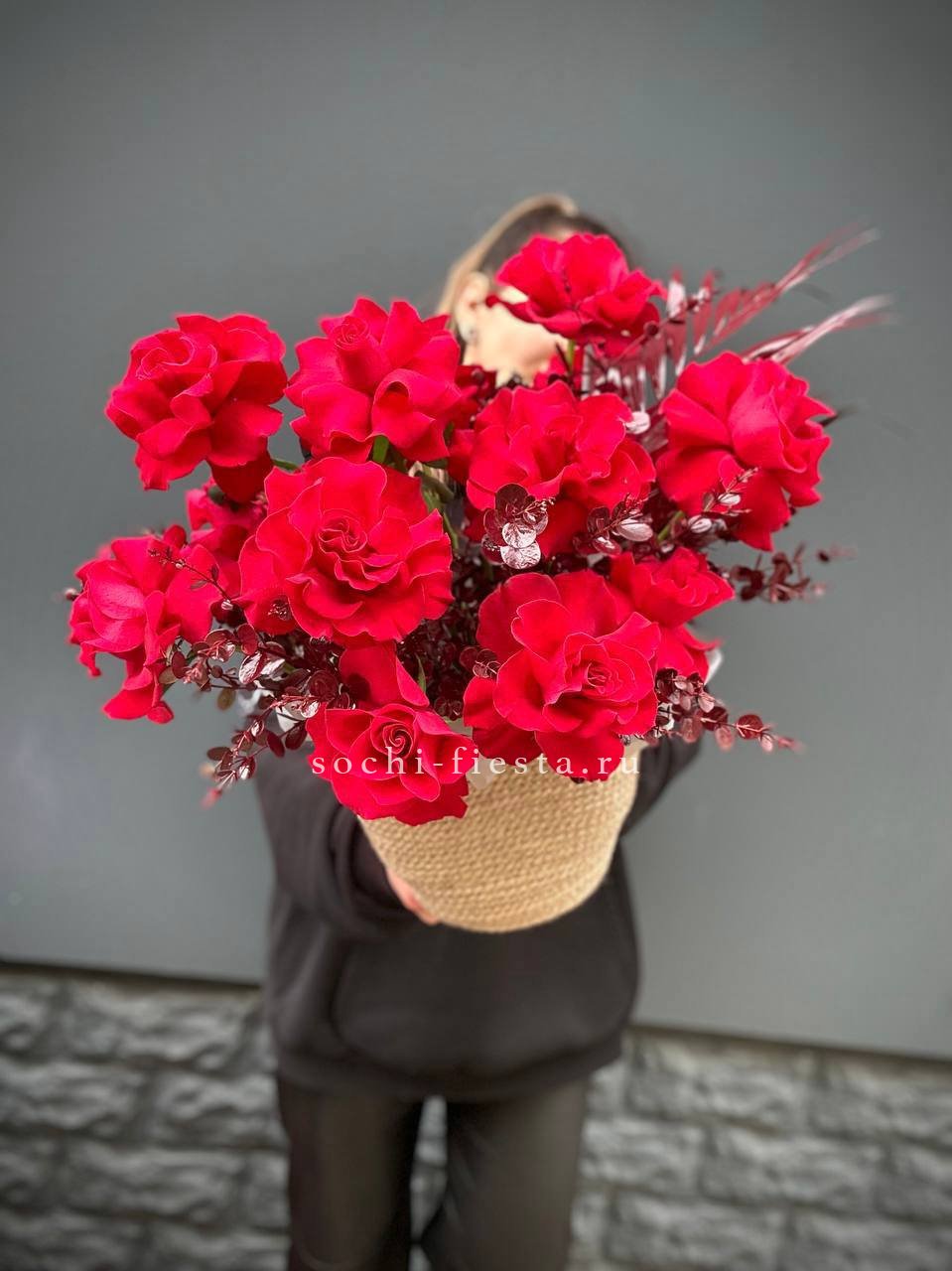 15 роз сорта джумилия, лента, дизайнерская упаковка.