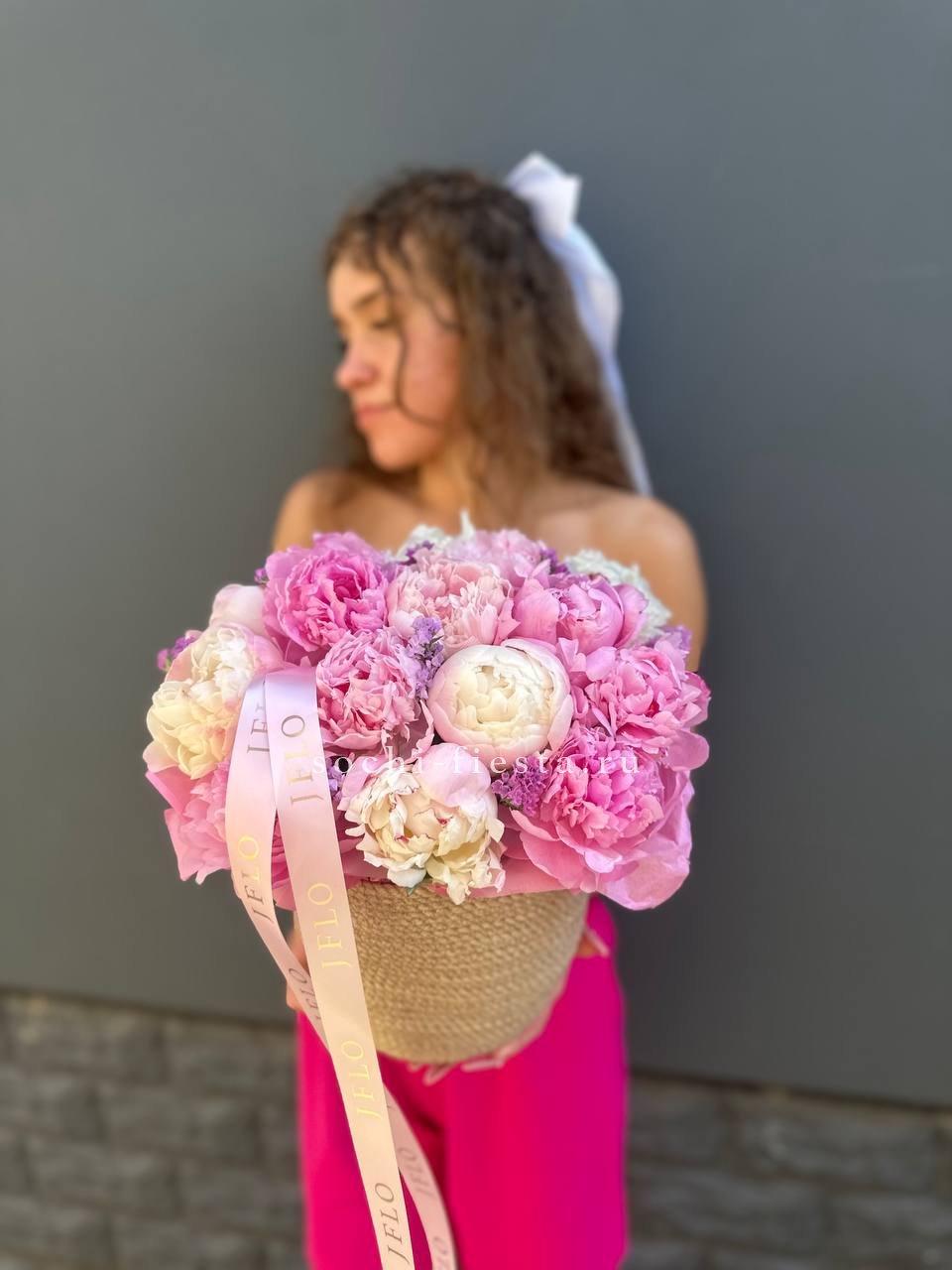 пионы, джутовое кашпо - D16, эвкалипт, лента, упаковка.