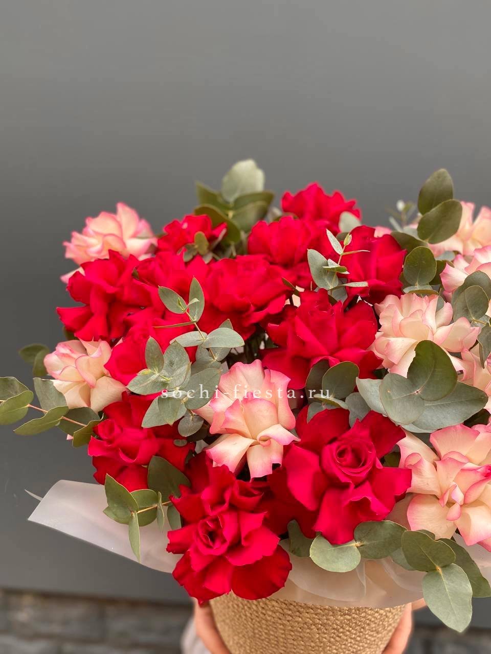 вывернутые французские розы, джутовое кашпо.