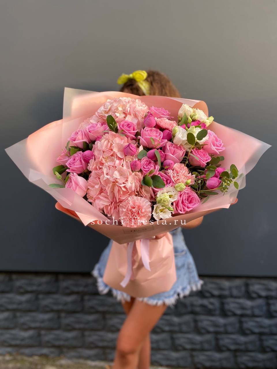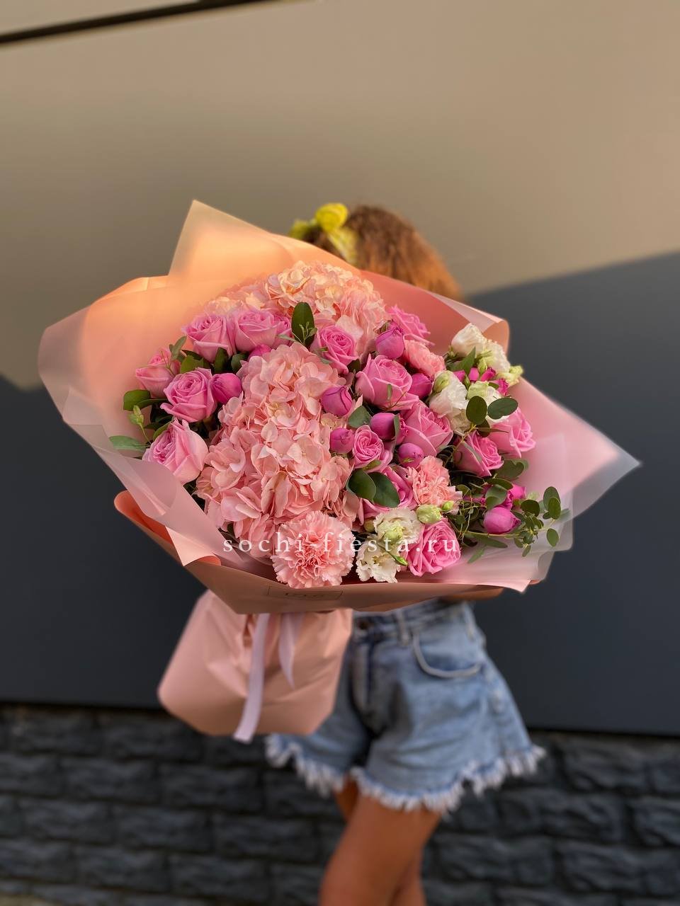 розовые гортензии, эвкалипт, пленка.