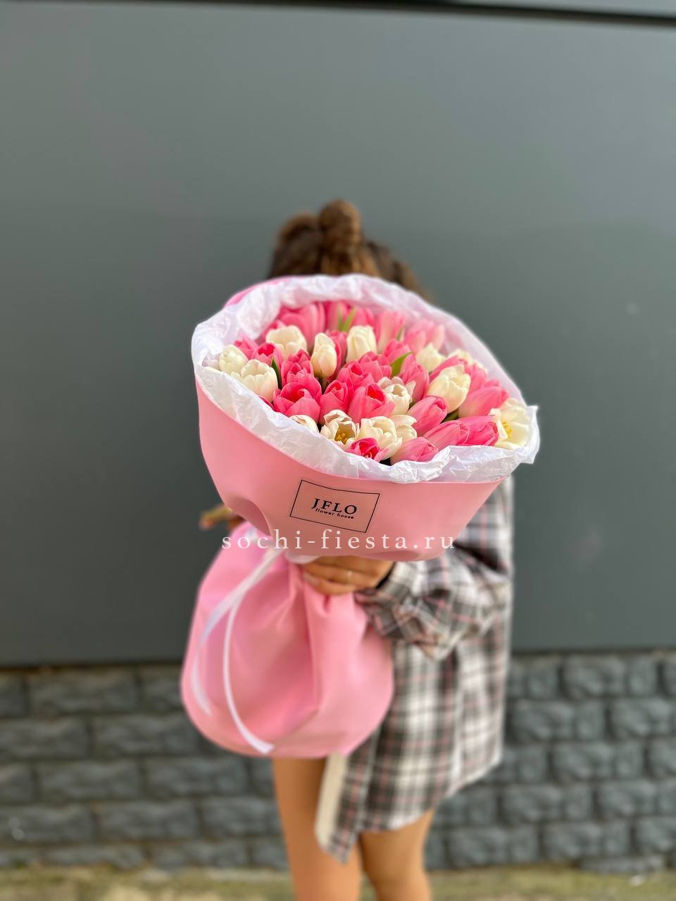 Пятьдесят один бутон в мягкой бело-розовой гамме создает объемную форму с живым ритмом. Микс оттенков добавляет воздушности и естественной динамики композиции.
