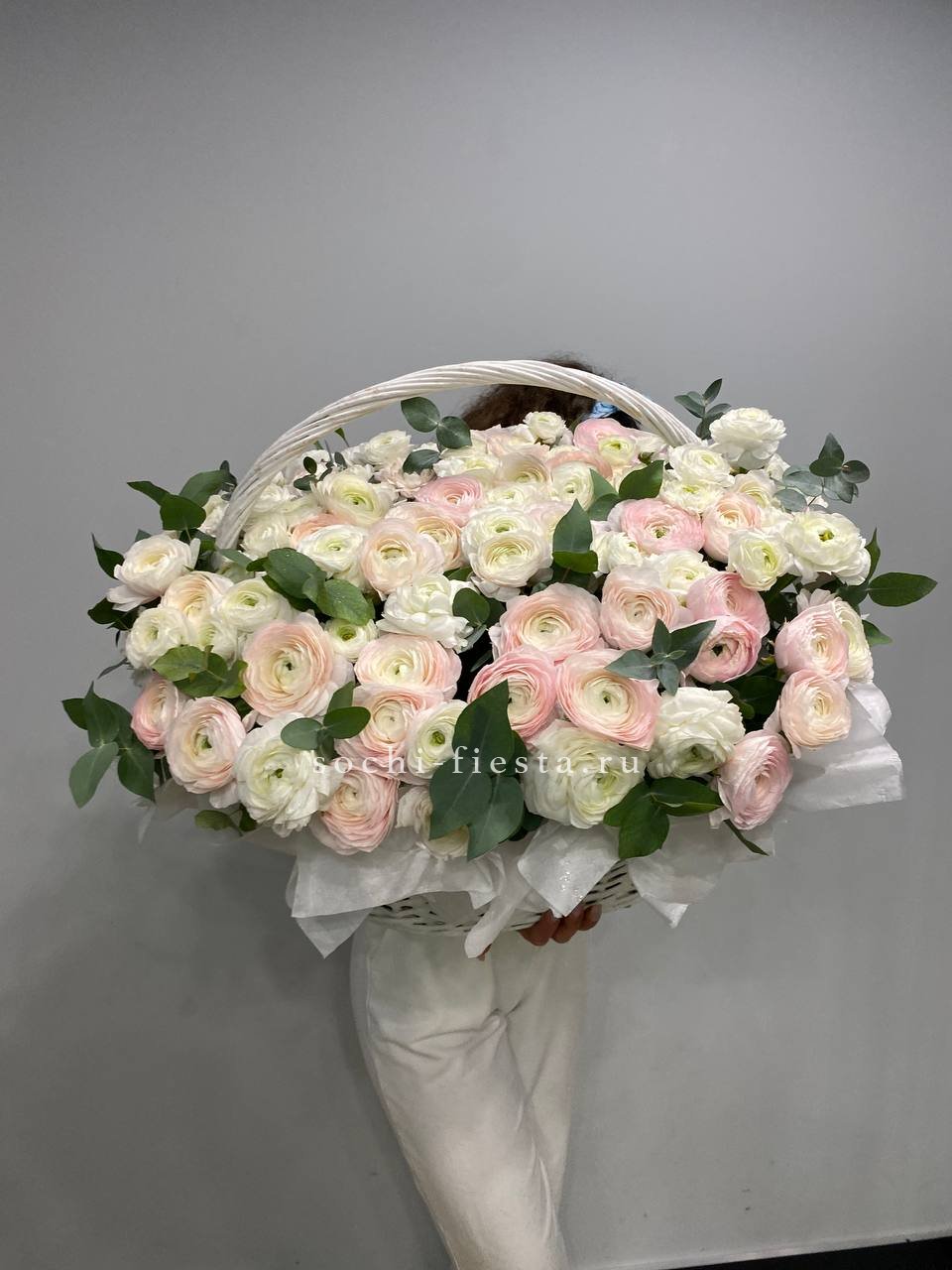 Белоснежные диантусы с пышными лепестками держат форму и долго сохраняют свежесть. Серебристый эвкалипт разбавляет плотность бутонов и добавляет прохладные нотки в композицию.