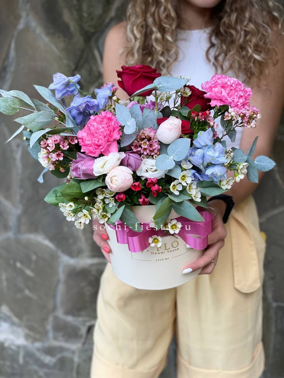 Сочетание пышной голубой гортензии и классических белых роз — это гимн нежности и чистоты. Букет, который не просто удивляет своим масштабом, но и дарит ощущение безмятежности. Идеальный выбор для самого искреннего признания.