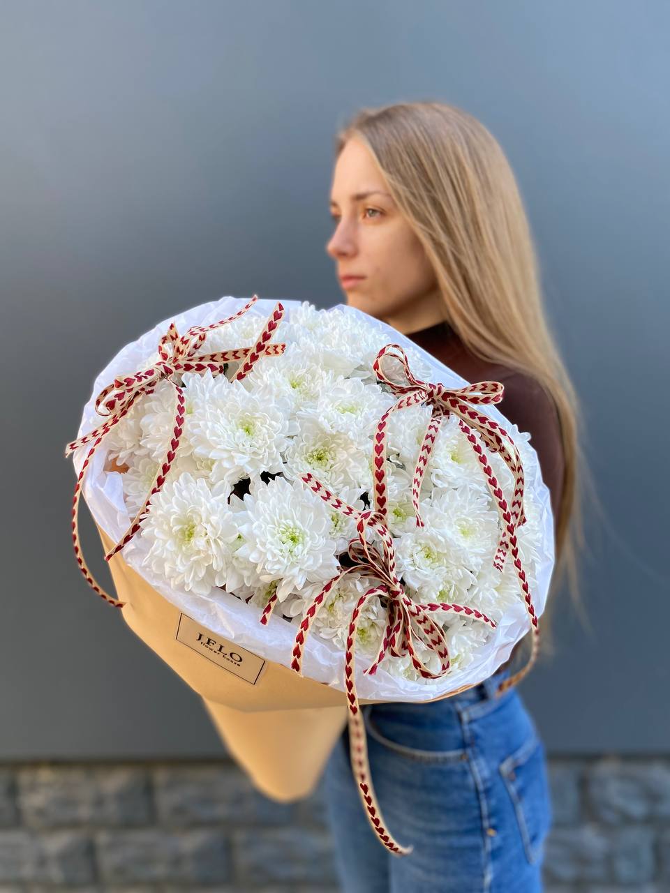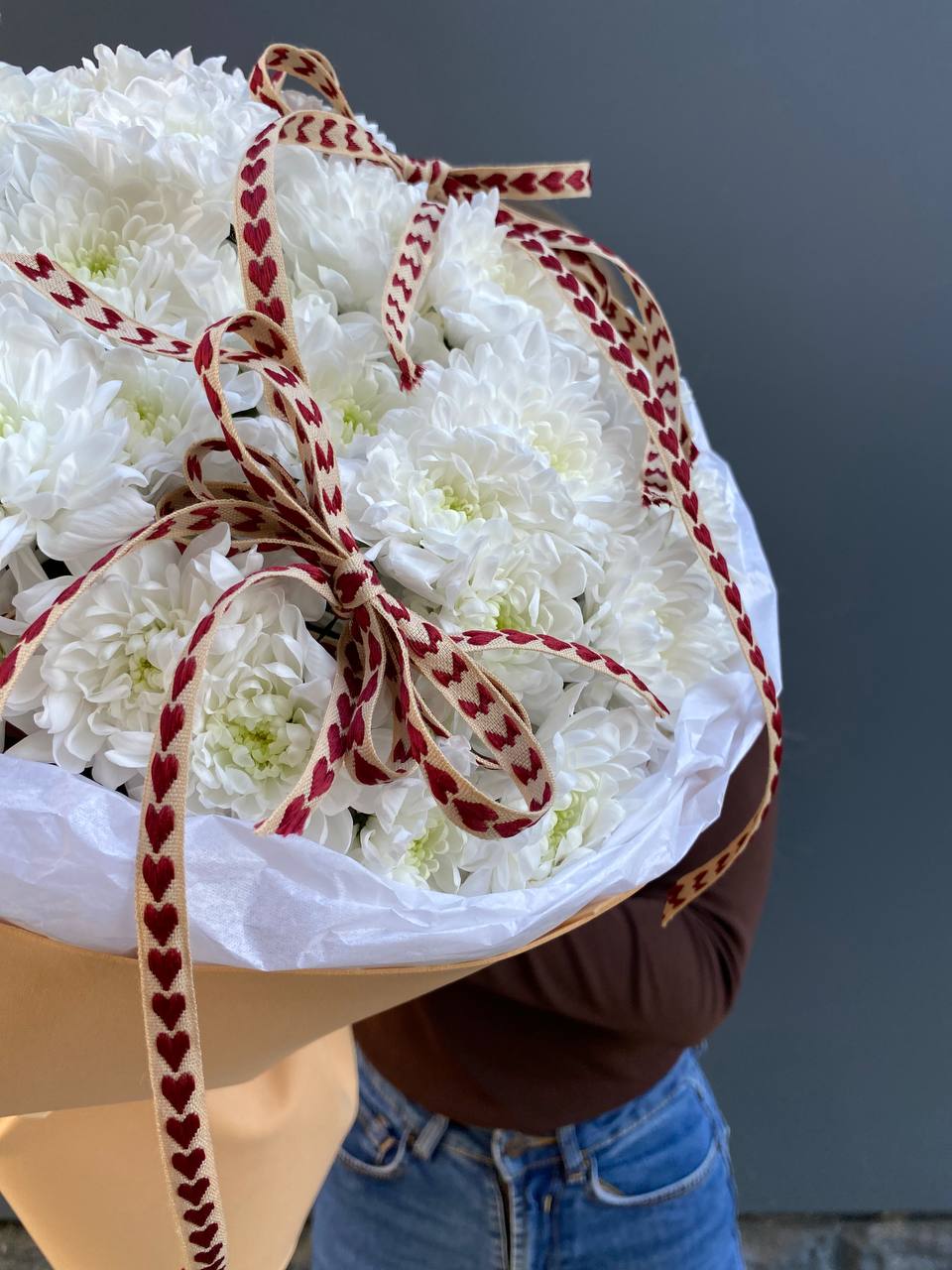 Пять веток кустовой хризантемы собраны в компактную форму с чёткими линиями. Лаконичная упаковка и лента сохраняют естественный объём соцветий. Букет выглядит собранно и свежо.