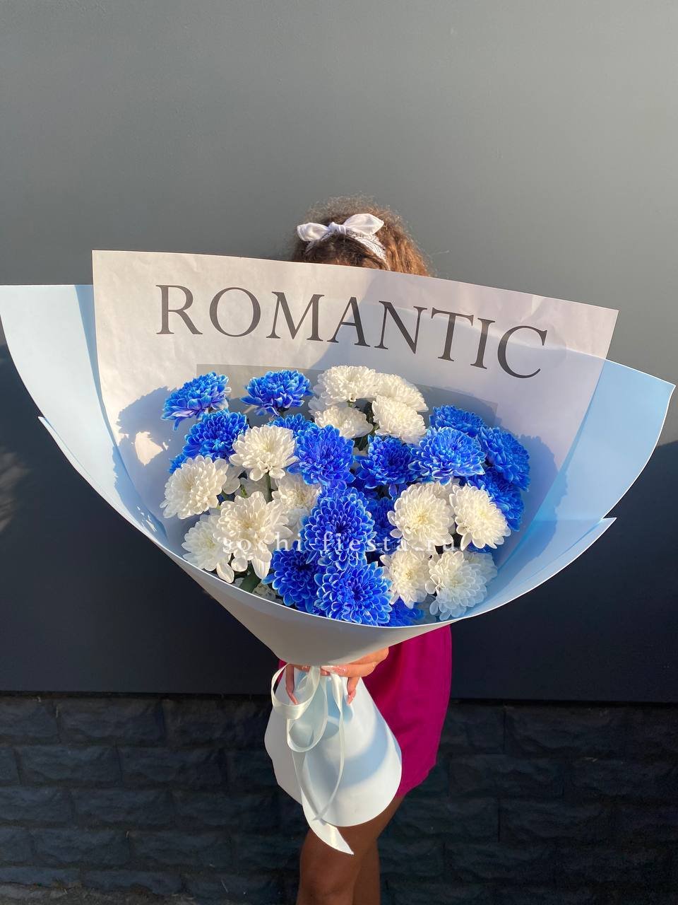 Девять веток кустовой хризантемы в синих оттенках собраны в плотный букет с лаконичной упаковкой. Насыщенный цвет и компактная форма создают яркое визуальное пятно в любом интерьере.