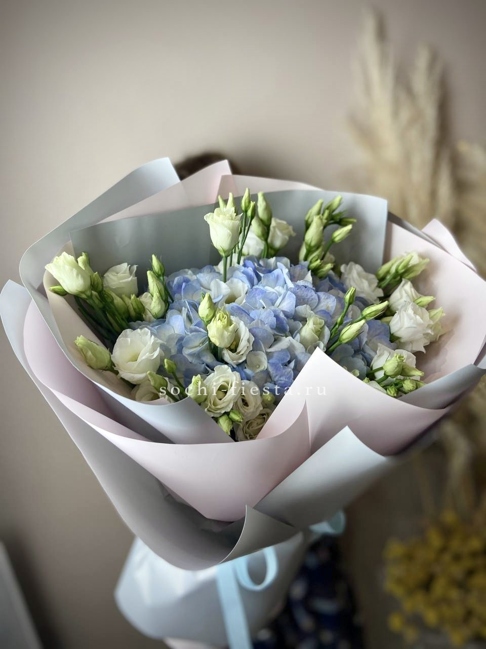 Крупные шапки гортензий формируют основу композиции, розы и эустомы заполняют пространство между ними. Диантусы добавляют графичности. Букет с впечатляющим присутствием и богатой палитрой.