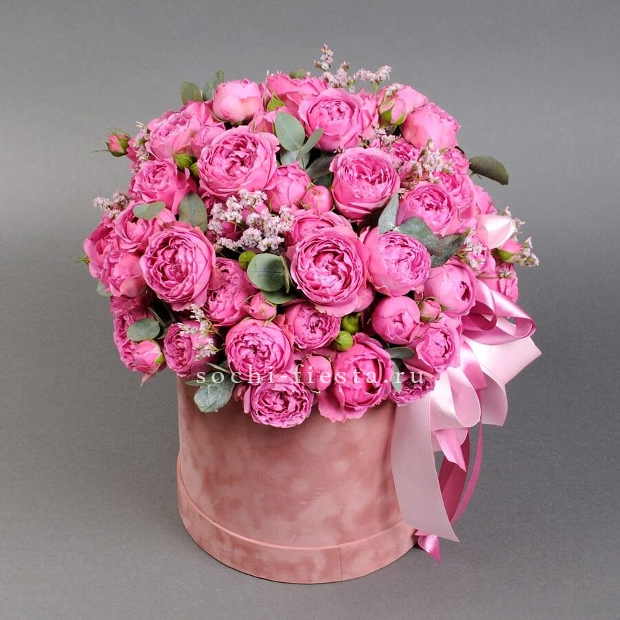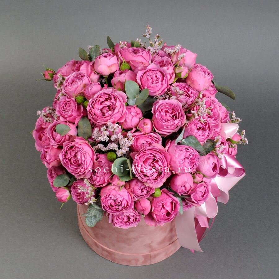 Розовые розы собраны плотной полусферой, где каждый бутон раскрывается навстречу свету. Диантусы добавляют воздушности, а эвкалипт мягко обрамляет композицию. Букет, который говорит без слов.