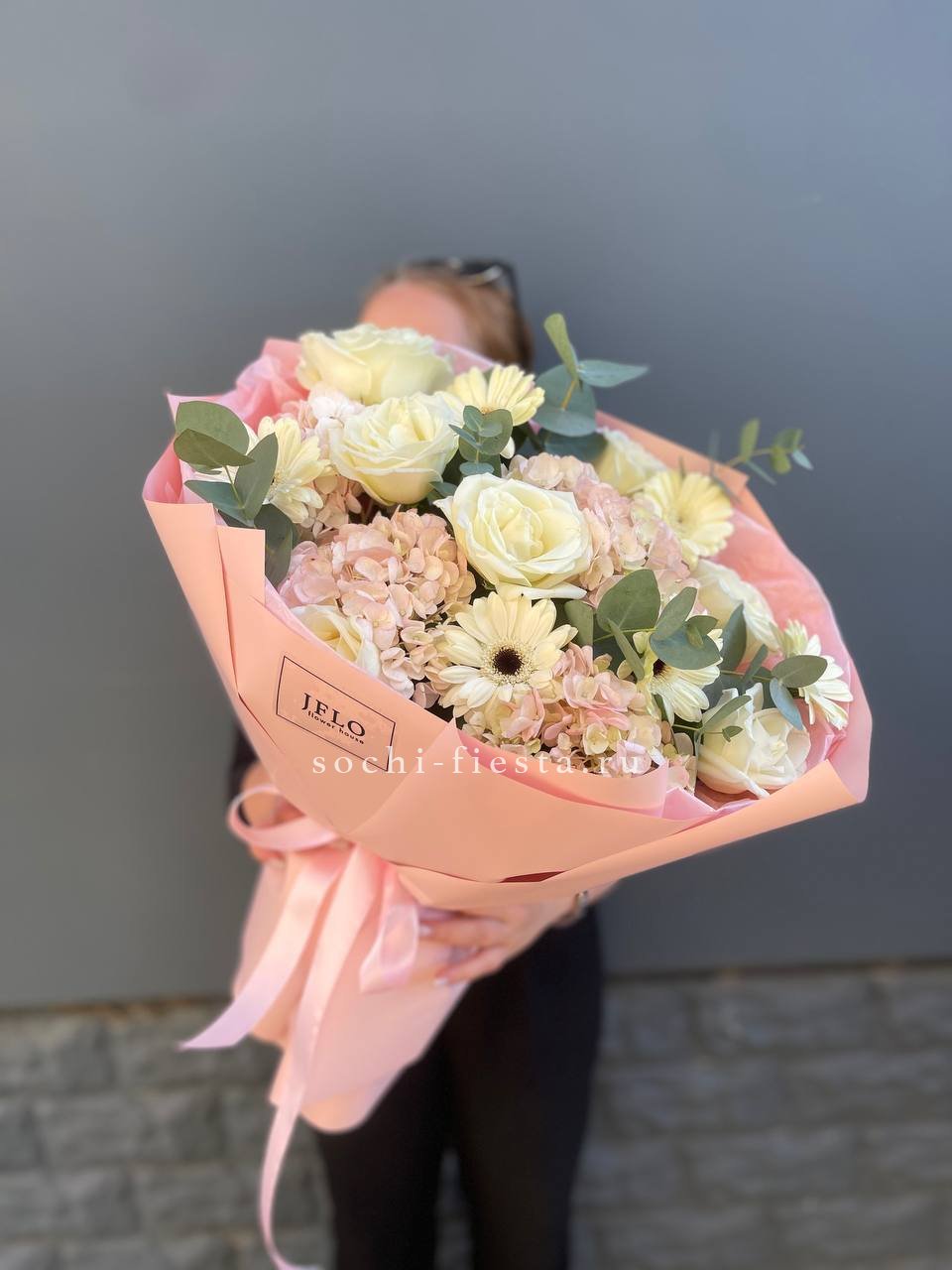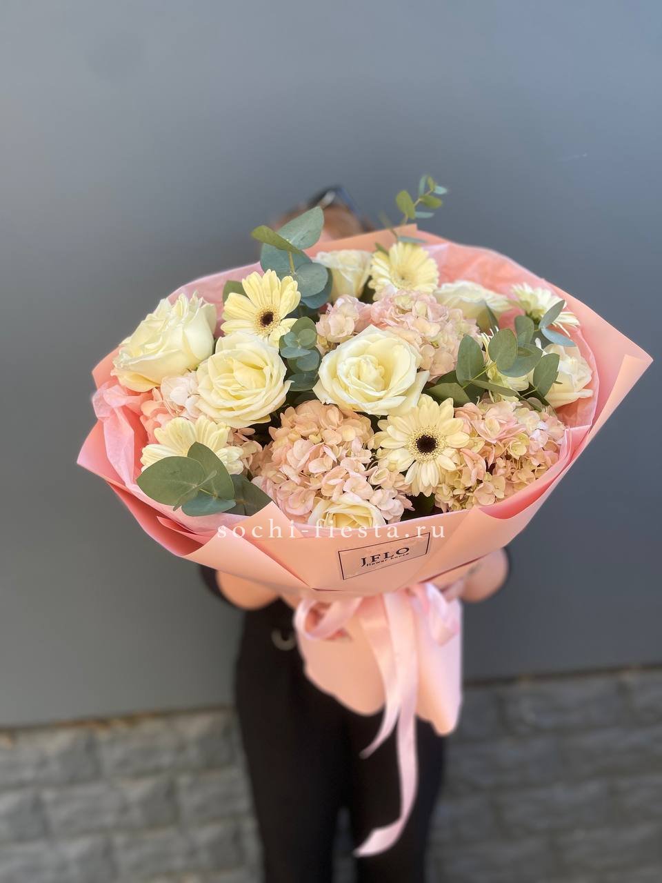 вывернутые розы, гортензия, пионовидные розы, эустома, лента, авторская упаковка.