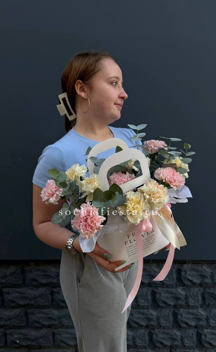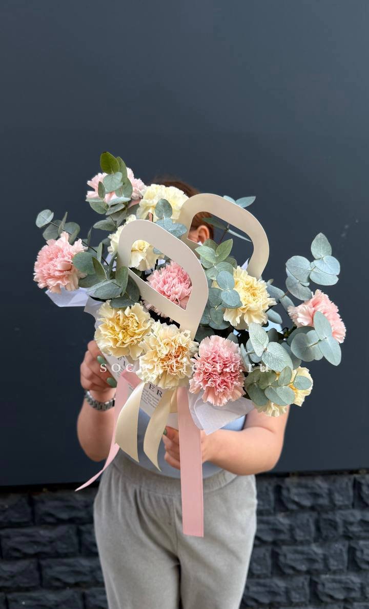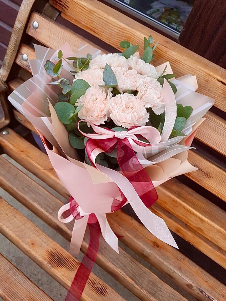 Семь кремовых диантусов раскрываются мягкими многослойными головками. Эвкалипт добавляет воздуха между бутонами и создает легкую асимметрию в общей форме.