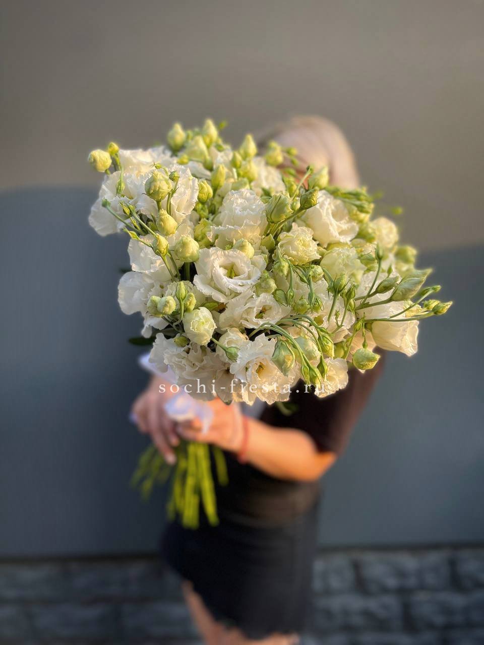 Двадцать пять веточек эустомы собраны в пышный букет и перевязаны лентой. Многослойные бутоны создают воздушный объём и мягкую игру оттенков. Классическая подача для тех, кто ценит естественную красоту цветка.