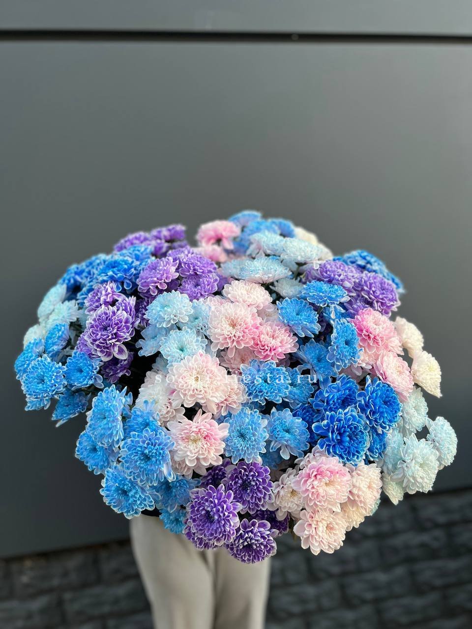 Двадцать пять веток кустовой хризантемы в миксе оттенков образуют живописное полотно. Каждый цвет звучит самостоятельно и при этом перетекает в соседний, создавая динамичную композицию.