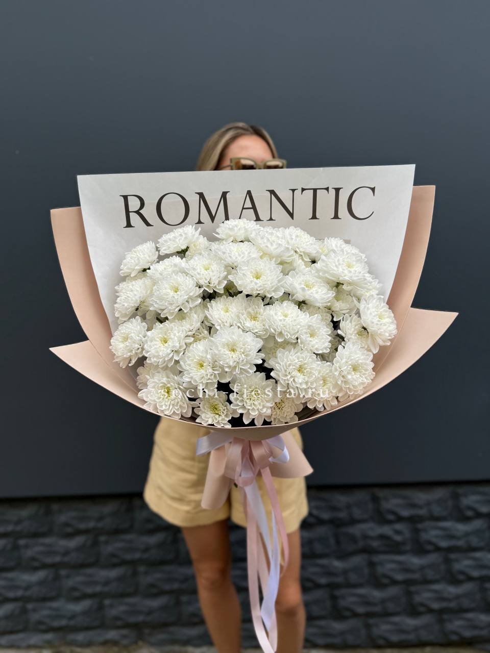 Девять кустовых хризантем собраны в плотный круглый силуэт. Каждая ветка раскрывается веером мелких соцветий, создавая объёмную текстуру. Букет держит форму и выглядит графично.