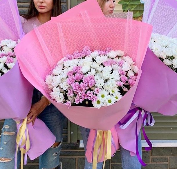 15-17 веток кустовых хризантем (белая + розовая), фоамиран, дизайнерская пленка.