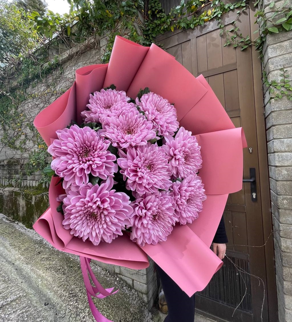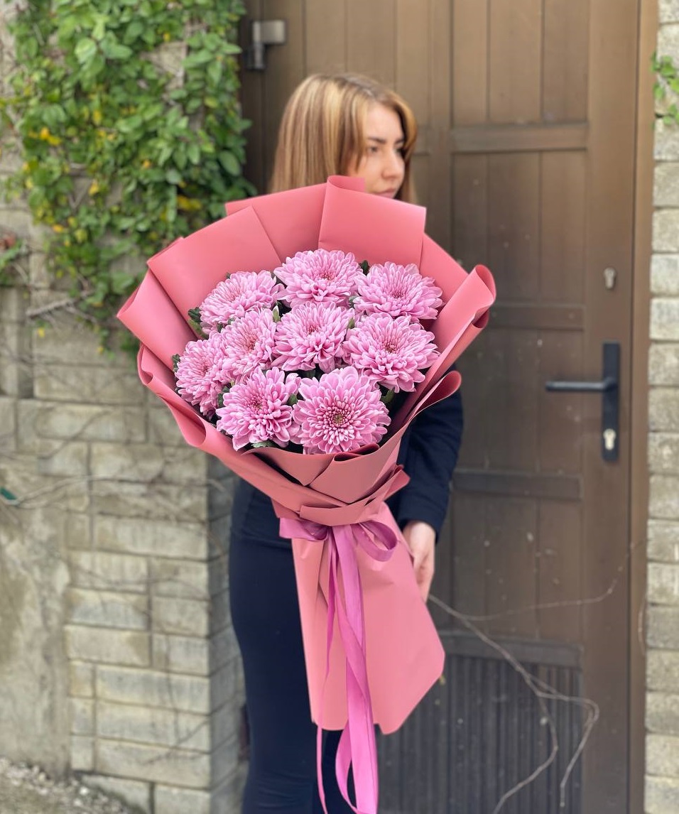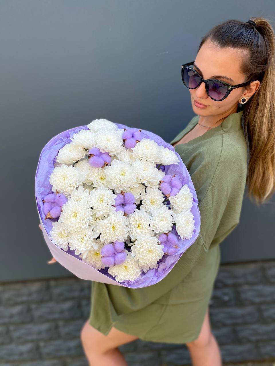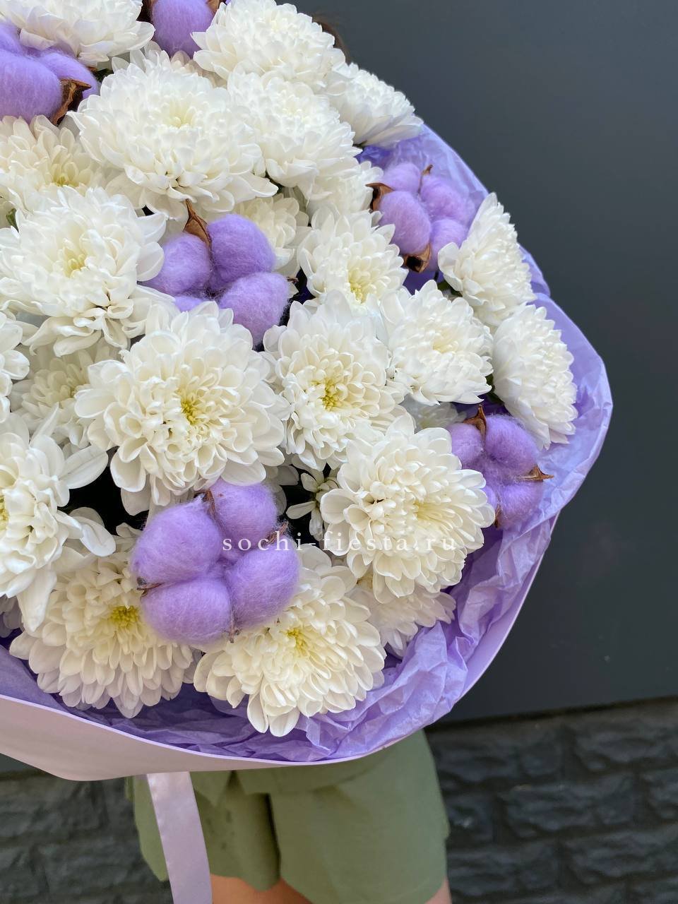 Пушистые коробочки хлопка добавляют воздушности между соцветиями хризантем. Природная фактура встречается с декоративной упаковкой в компактной форме. Букет держит объём и выглядит свежо несколько дней.