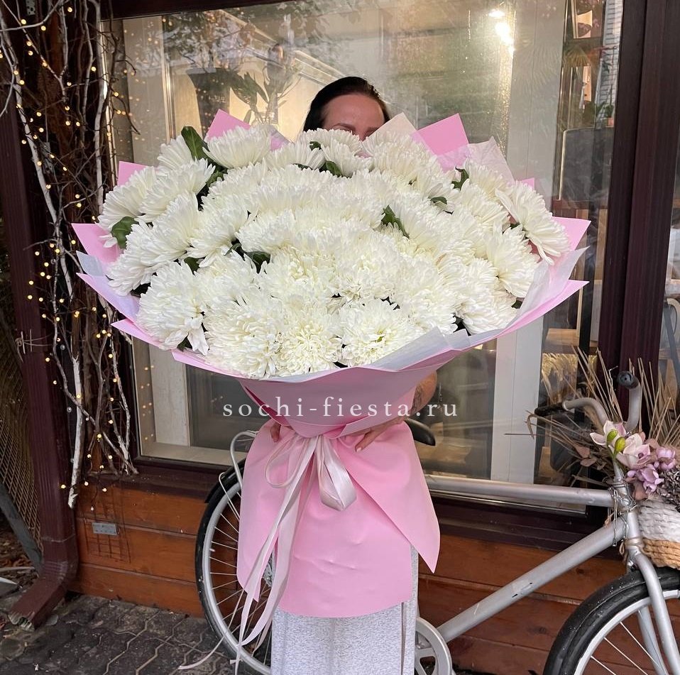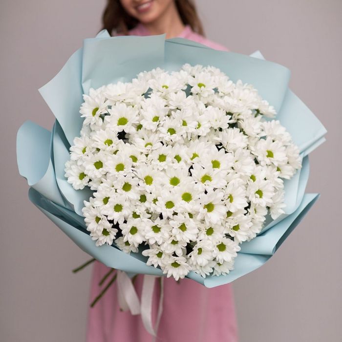 Семь крупных хризантем с открытыми бутонами в дизайнерской упаковке. Букет выглядит свежо и современно, легко вписывается в любое пространство.
