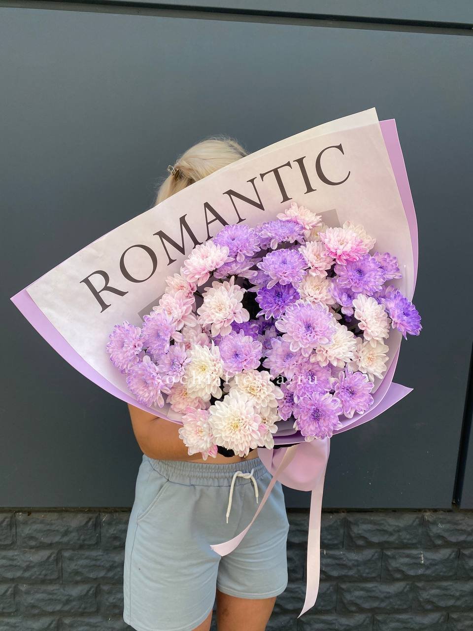 Сиреневая гамма с переходом в розовый создаёт мягкую дымку соцветий. Кустовые хризантемы собраны в плотную шапку, где каждая ветка раскрывается своим ритмом. Монохромная композиция для тех, кто ценит спокойную красоту.