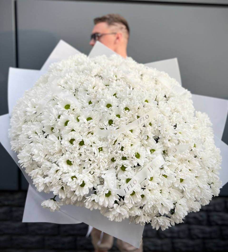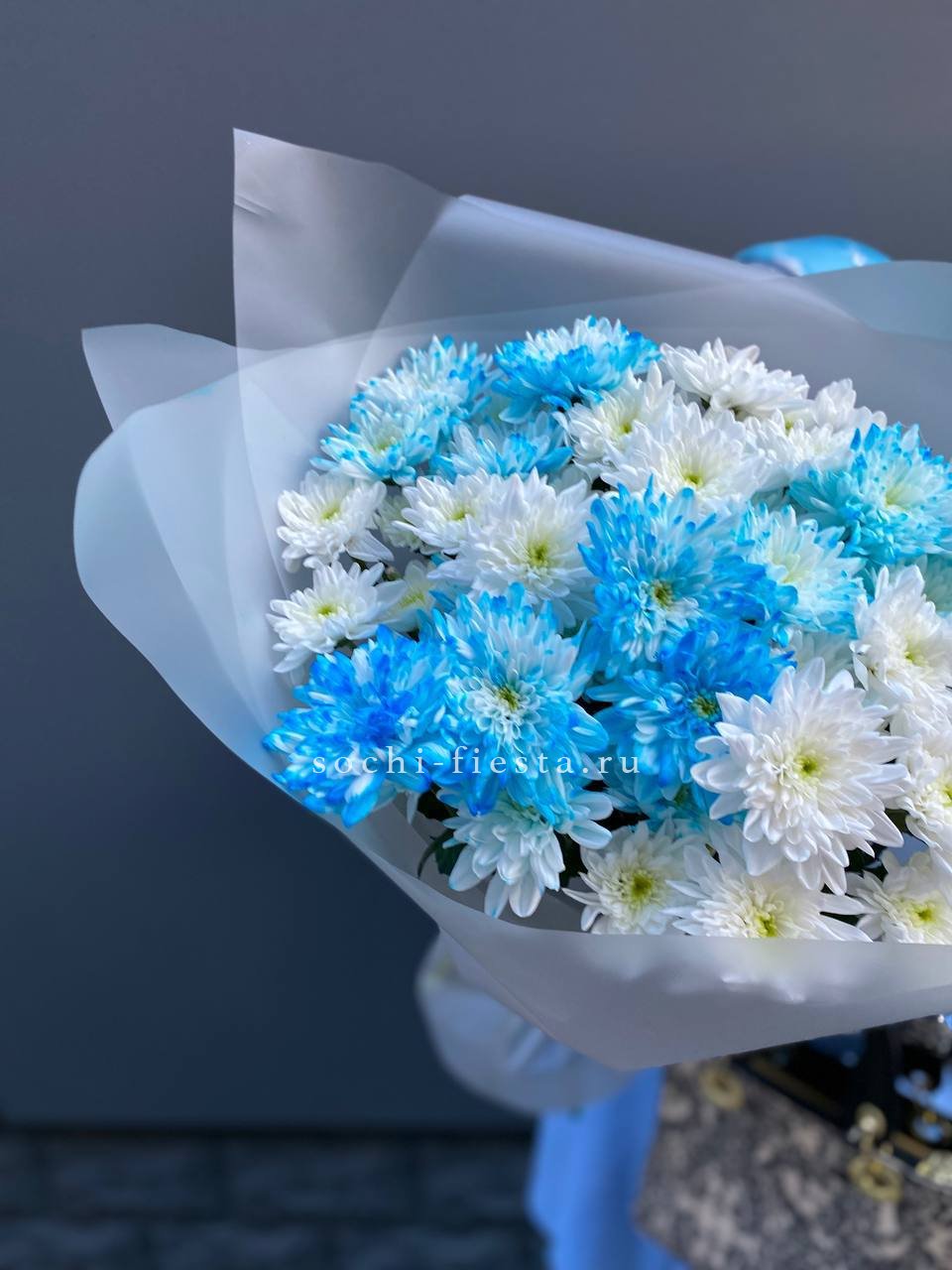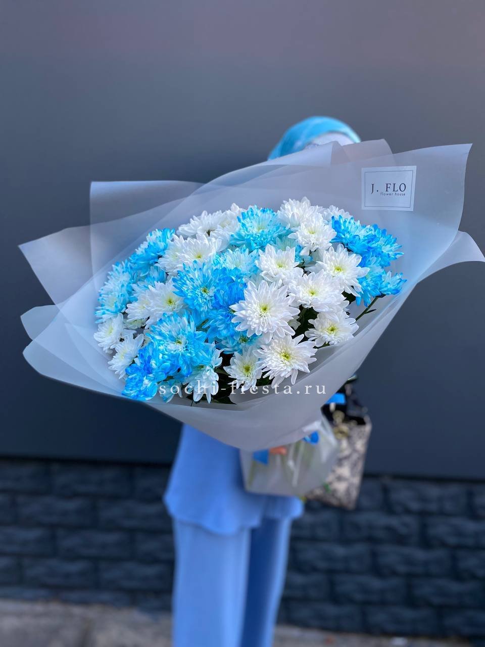 хризантемы - 7 шт, эвкалипт,  лента, дизайнерская упаковка.