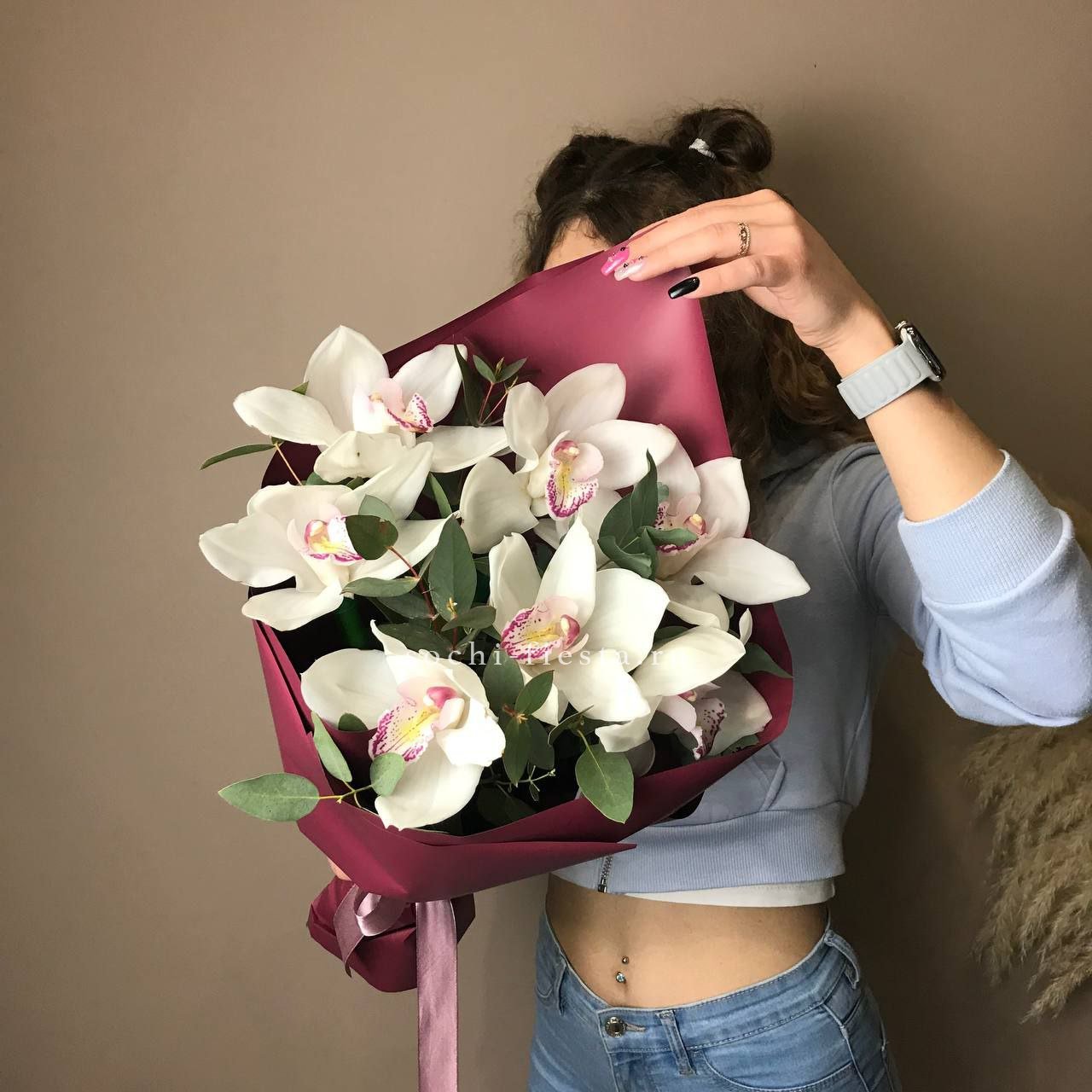 орхидея цимбидиум - 7 шт., декоративная зелень, упаковка на выбор.
