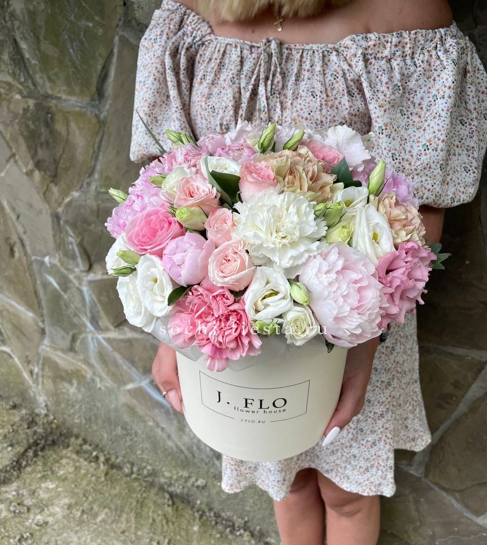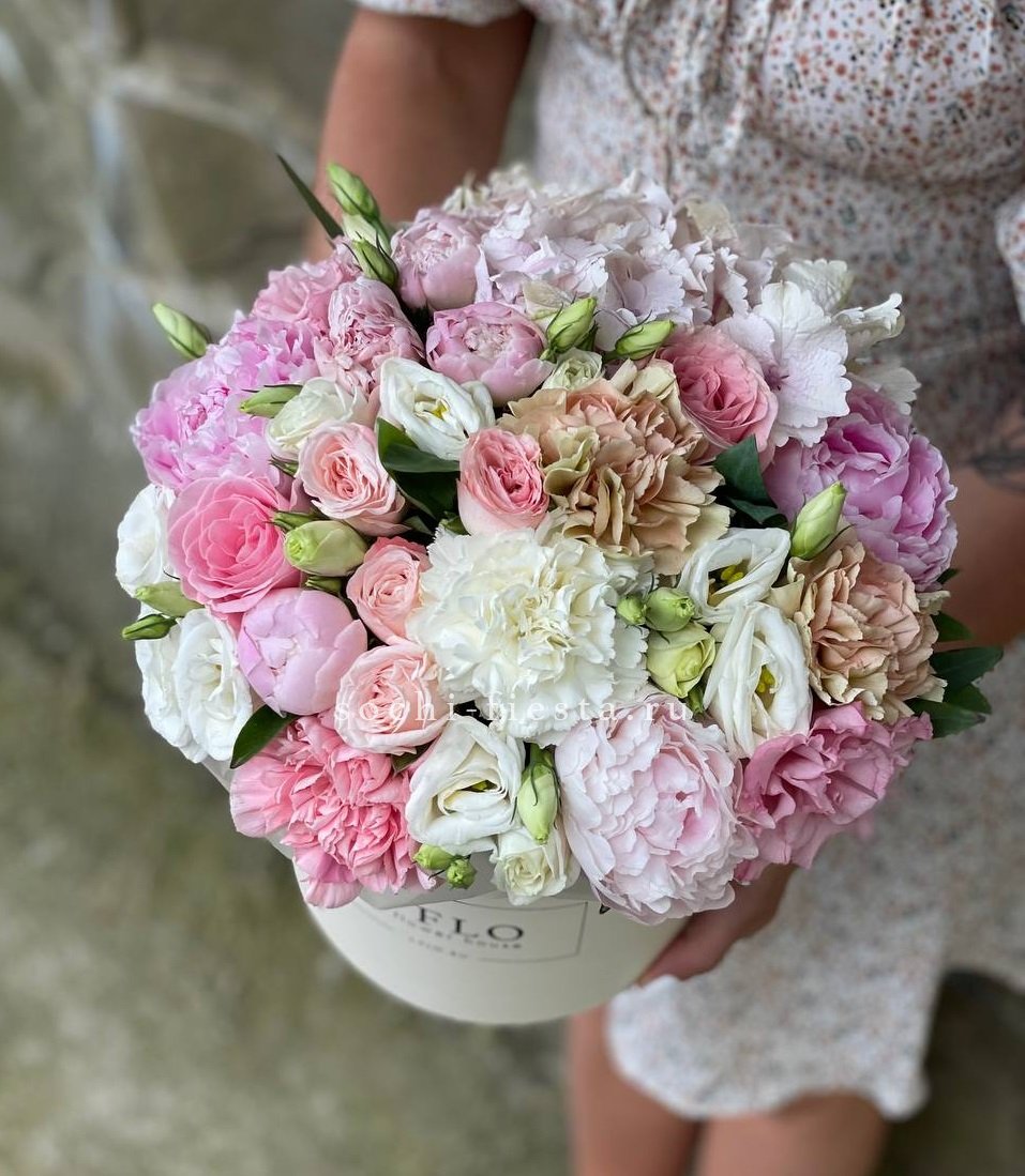 Пятнадцать пионов в бело-розовой гамме собраны в воздушный букет с плавными переходами оттенков. Мягкие лепестки создают объёмную фактуру, а дизайнерская упаковка завершает композицию.