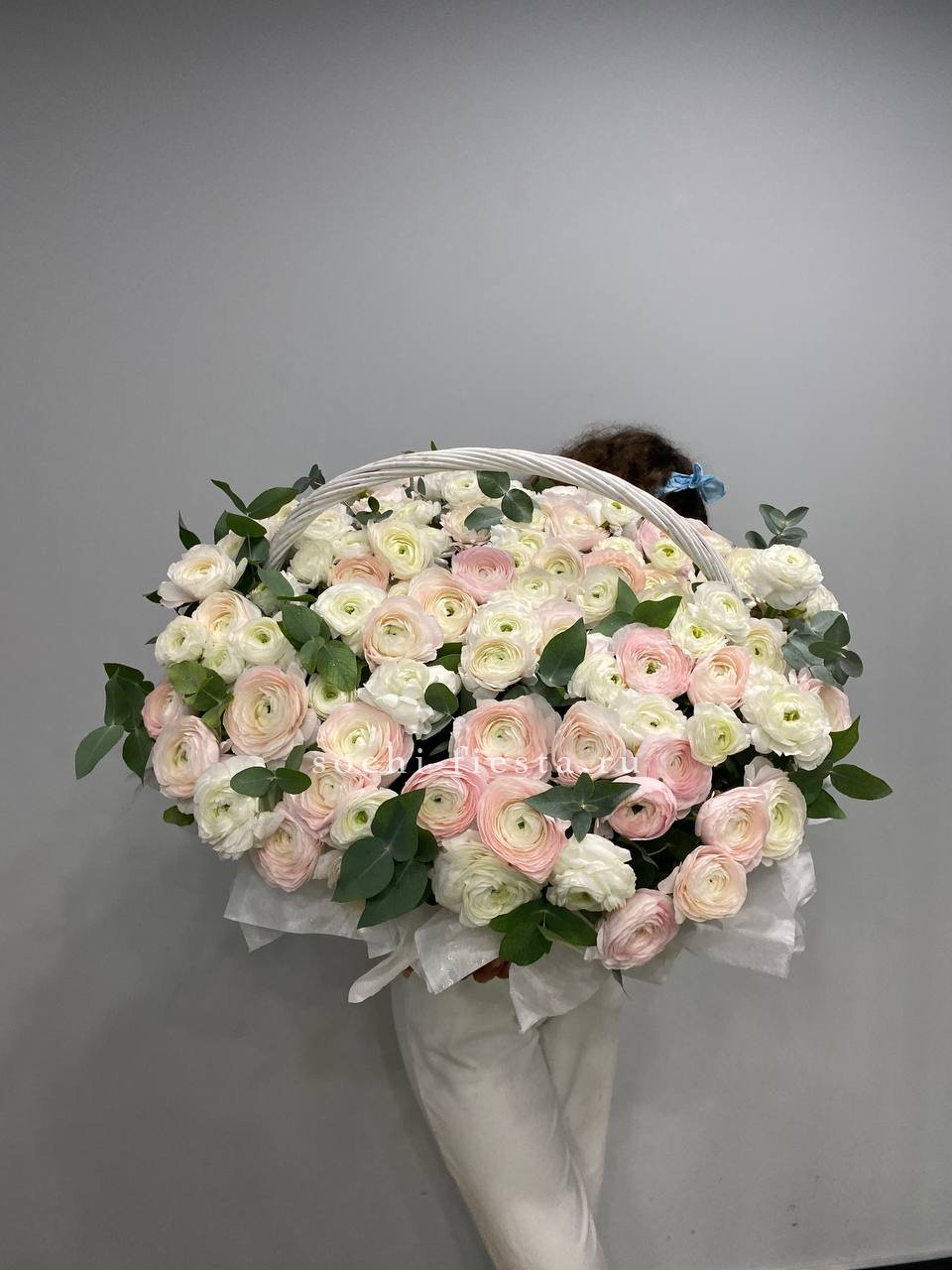 на фото 113 ранункулюсов микс  с эвкалиптом в корзине Вы можете согласовать с менеджером любое количество) Такой объём лучше заказывать за 1.5 недели)