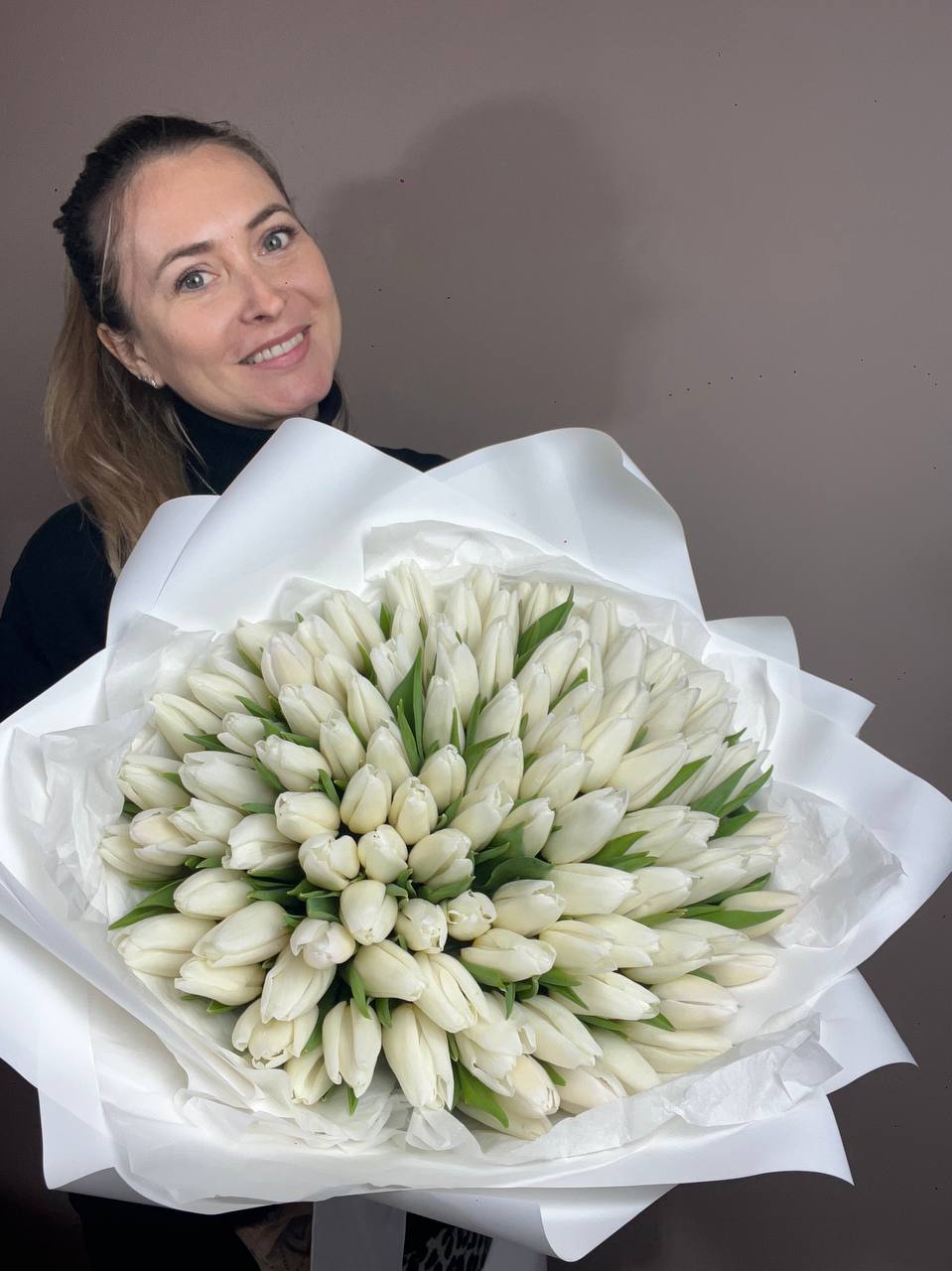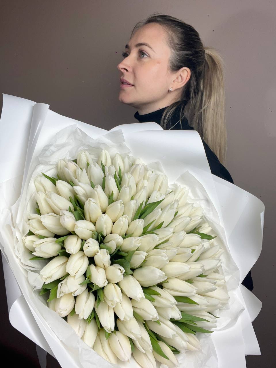 Сто один тюльпан в светлой гамме создаёт впечатляющий объём и выразительное присутствие. Плотная сборка бутонов образует графичную форму с чётким силуэтом.