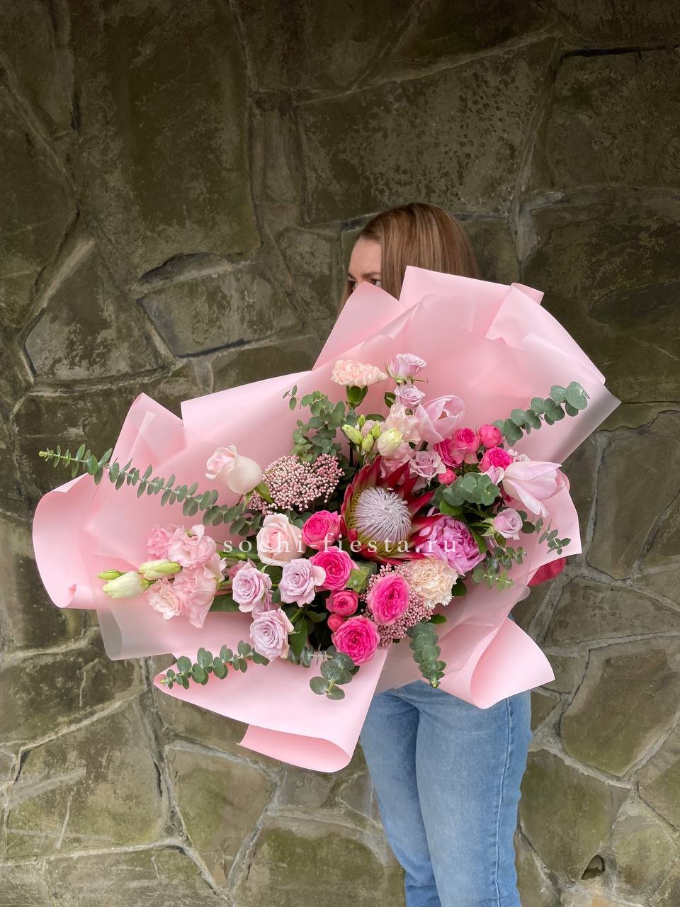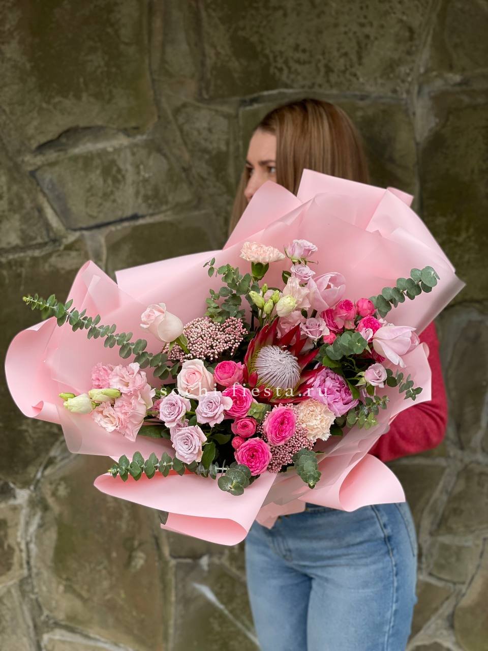 Протея задает графичный акцент, а пушистые шапки гортензии создают объем и глубину. Пионовидные розы и эустома дополняют композицию мягкими переходами, озотамнус добавляет воздушность.
