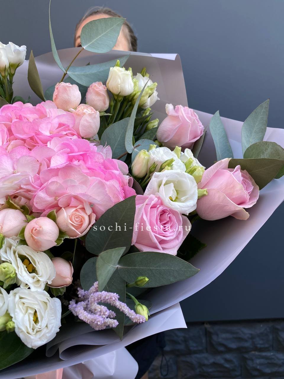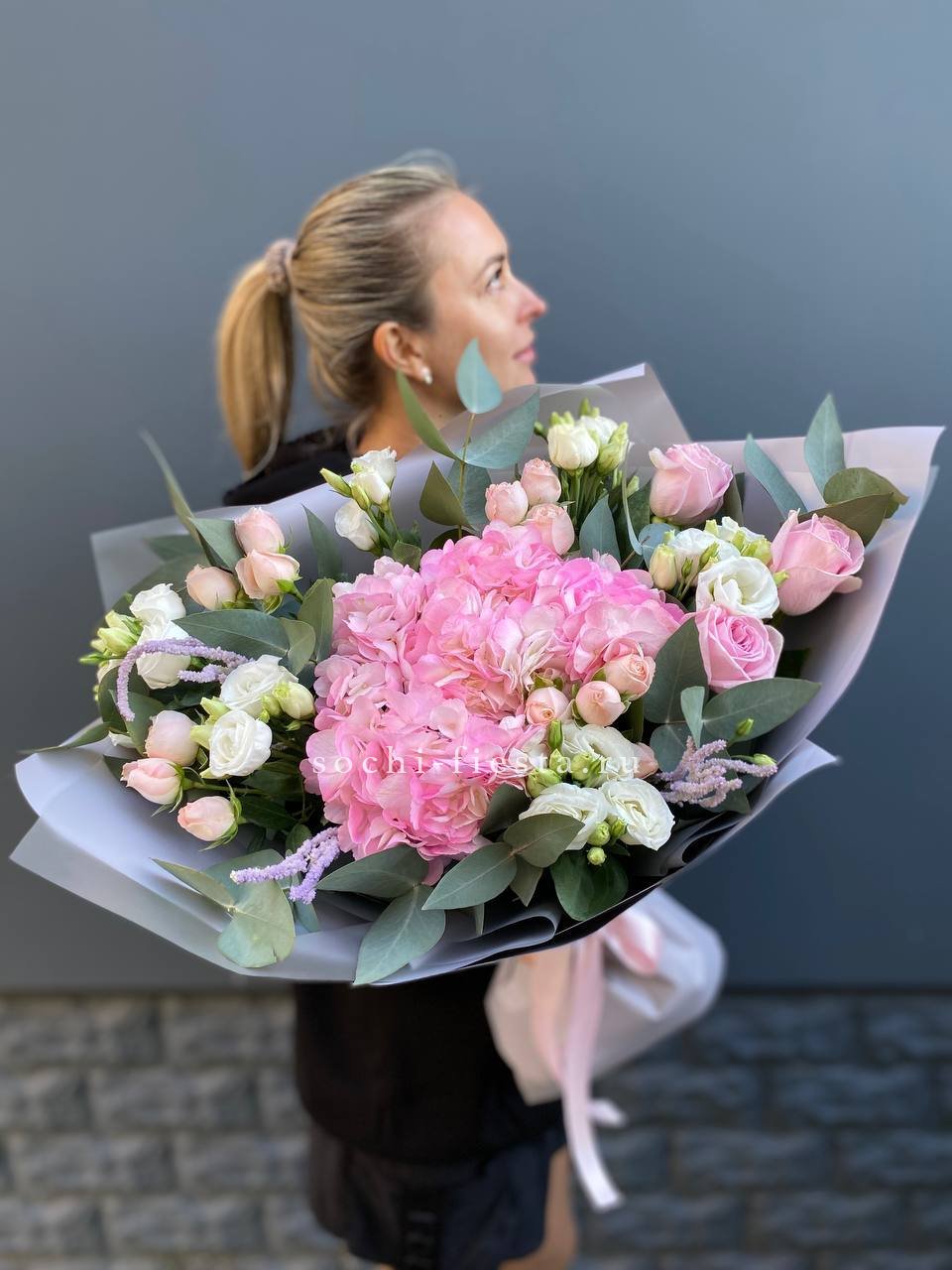 гортензия, эустома, кустовая роза, маттиола (или львиный зев), роза одноголовая, каллы (или аналог), эвкалипт, лента, упаковкаСостав букета в несозон может нести незначительные изменения.