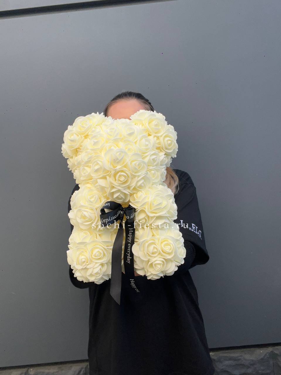 Белый медведь из фоамирана в оттенке шампань напоминает облако из мелких бутонов. Плотная структура материала держит форму и сохраняет первоначальный вид надолго.
