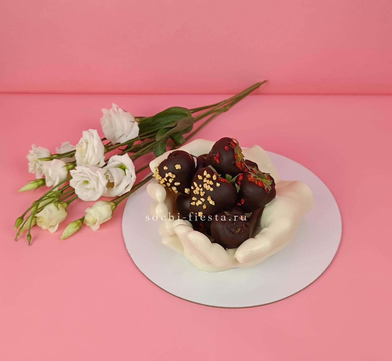 Свежая клубника в бельгийском шоколаде размещена на ладонях из того же материала с жестом мира. Посыпка из орехов или конфетти добавляет текстурный акцент каждой ягоде.