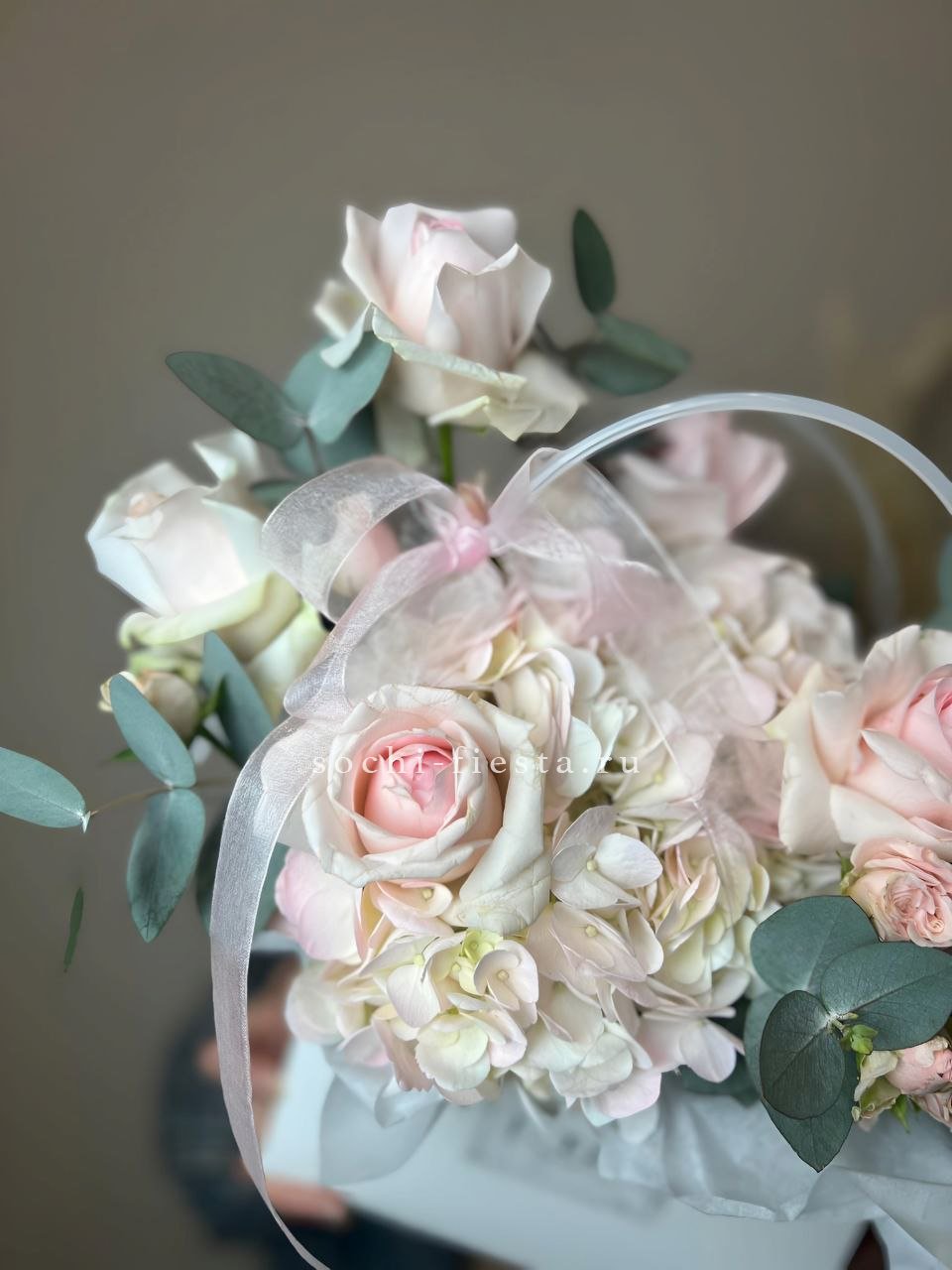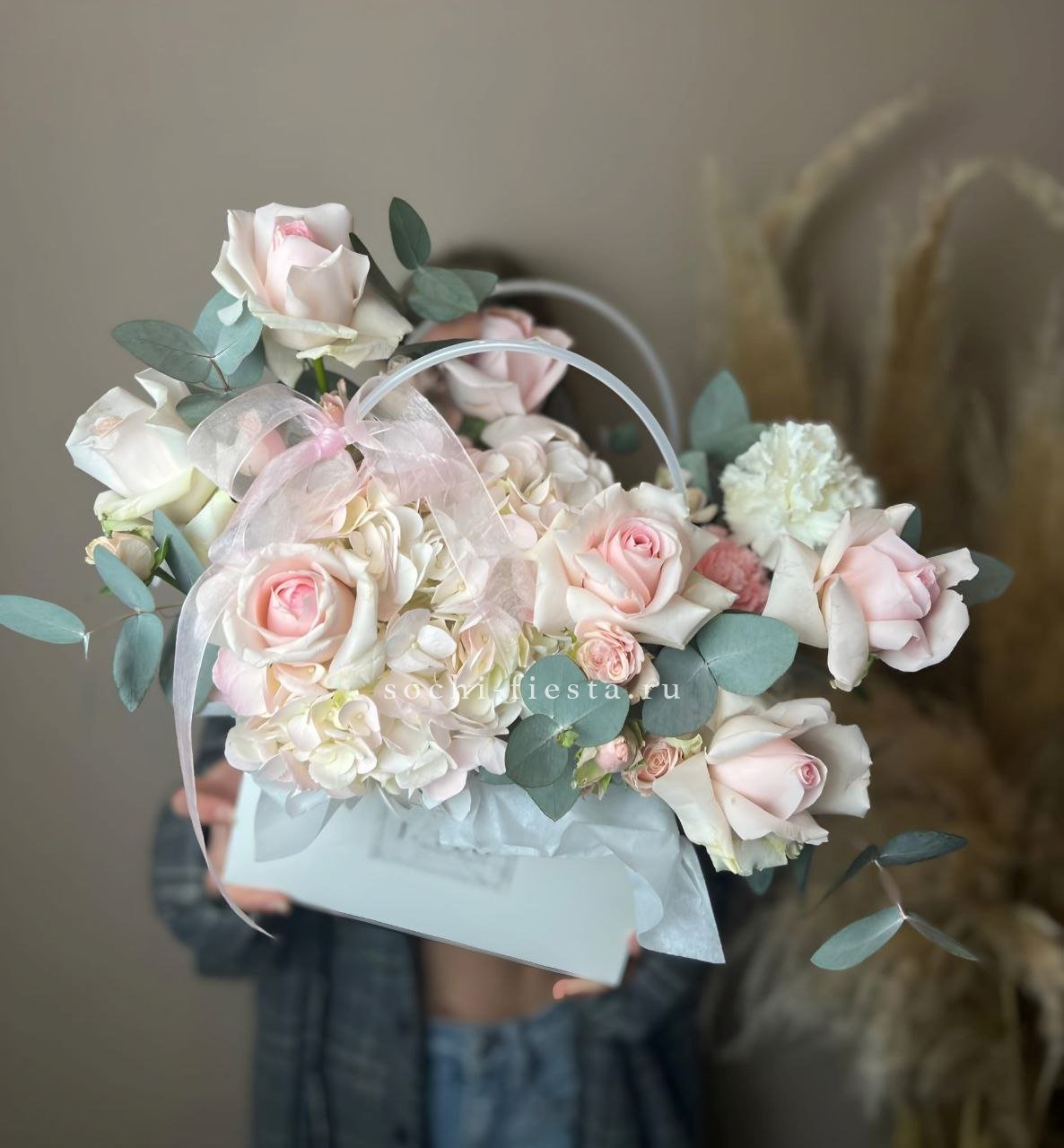 герберы, эустома, белая роза, эвкалипт, лента, сумка-кашпо.