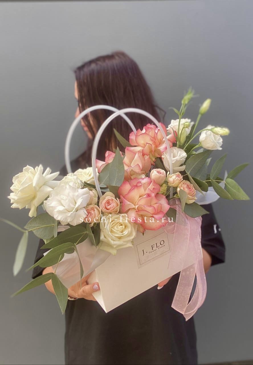 розовая и белая розы, пионовидная роза, кустовые розы, эвкалипт, лента, сумка.