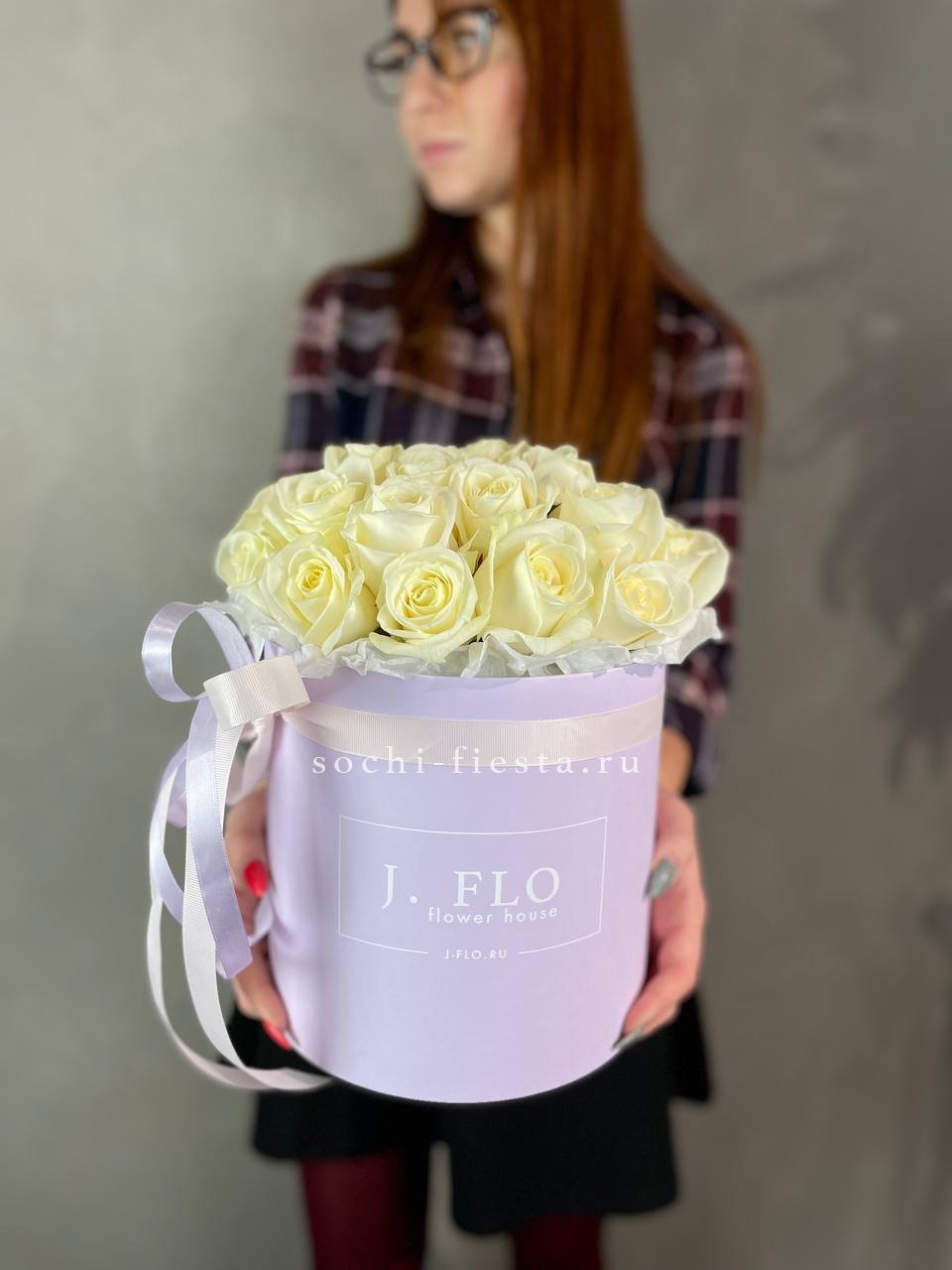 Белые французские розы раскрываются крупными бутонами и соседствуют с воздушной эустомой. Композиция создает ощущение легкости и света.