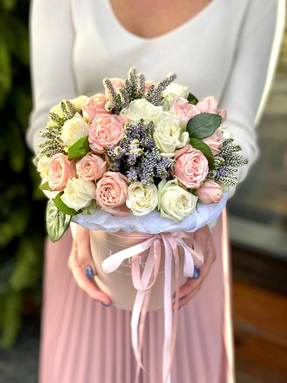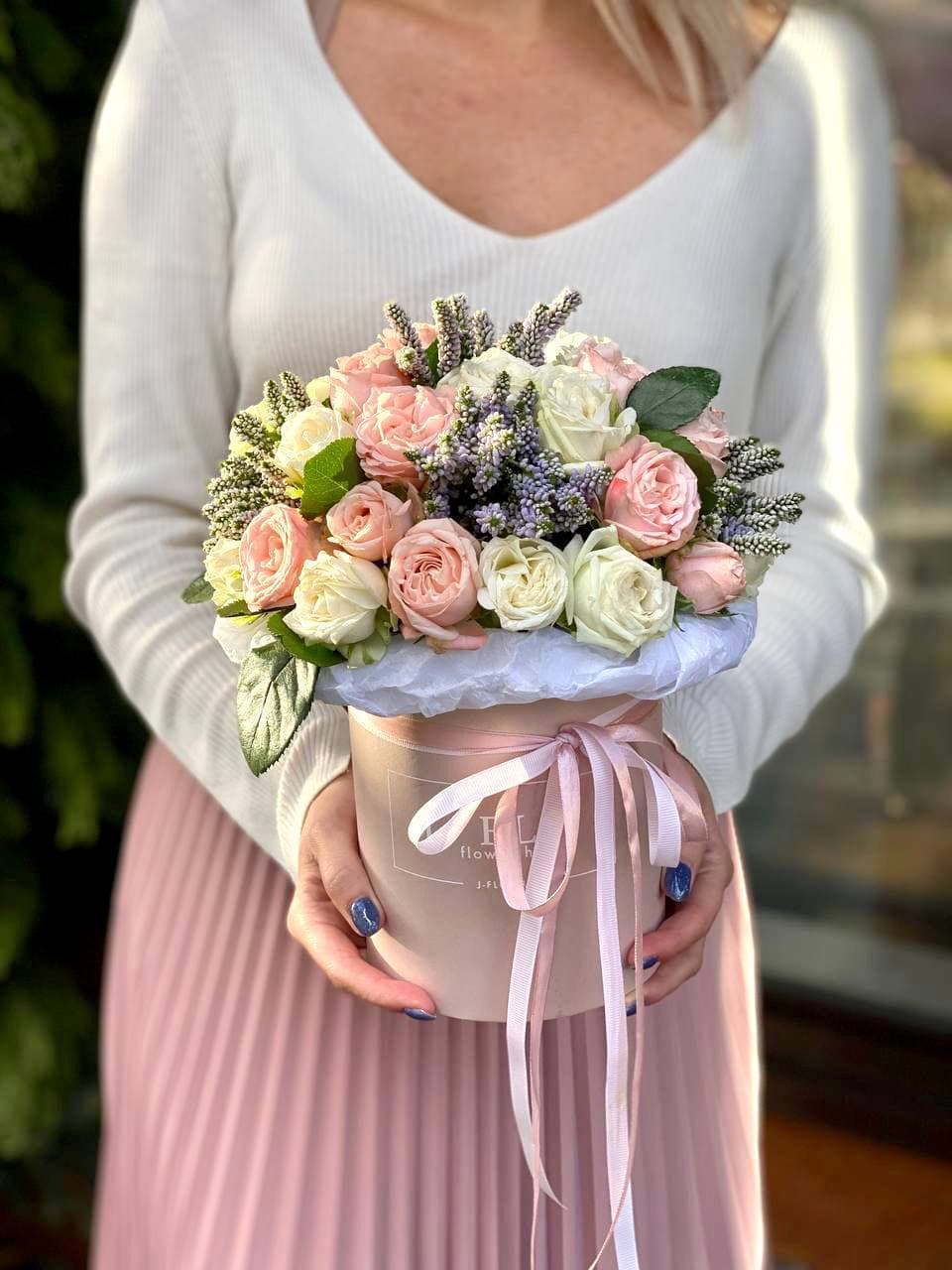 Эустомы и пионовидные розы соседствуют с французскими макарон в коробке в форме сердца. Диантусы и эвкалипт создают объём, а сладкий акцент делает композицию завершённой.