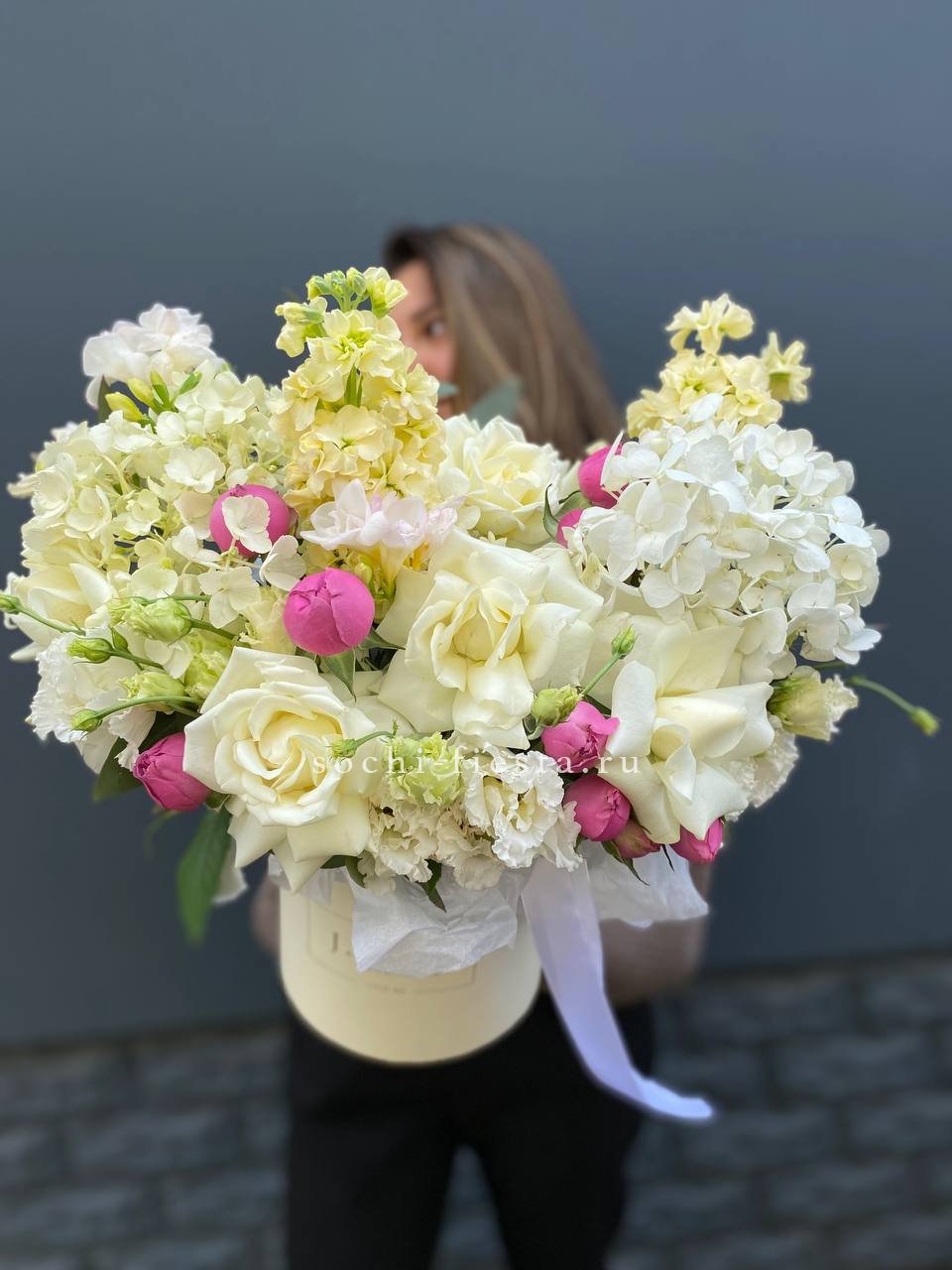 белые французские розы, эустома, гортензия, маттиола,  цилиндр D16.