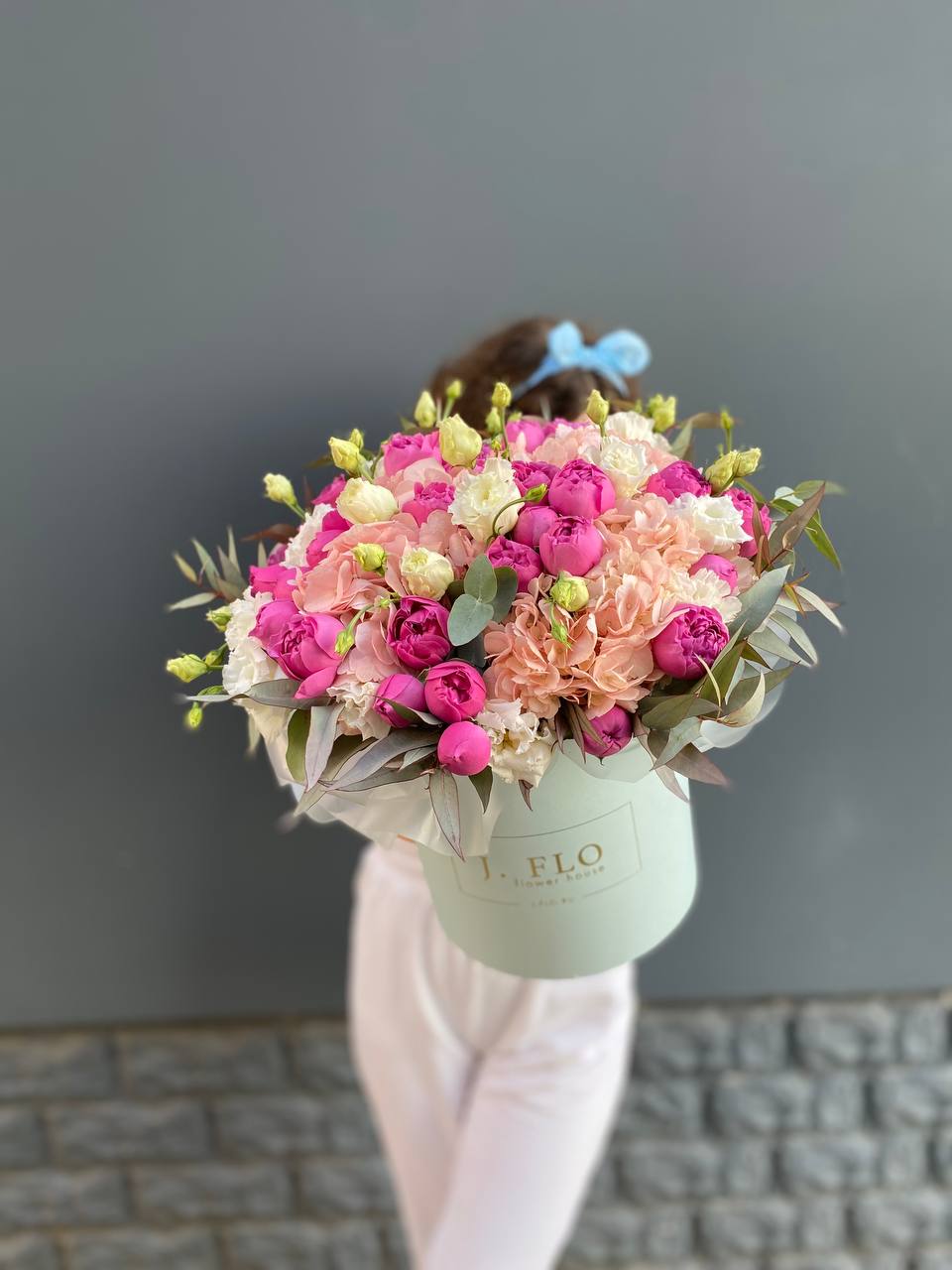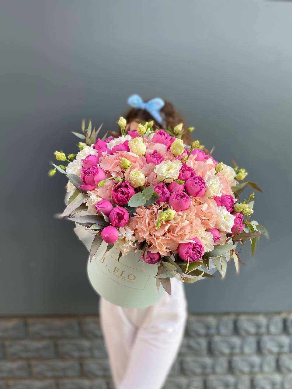 Воздушная композиция в пастельной гамме с акцентом на фактуру раскрытых бутонов. Пионовидные розы и эустома создают объёмный силуэт, а хлопок добавляет графичности.