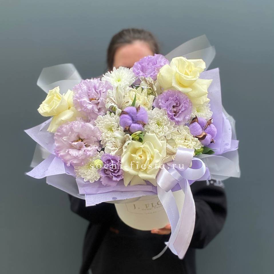 Композиция собрана из альстромерий, эустомы и хризантем с добавлением воздушного хлопка. Мягкие оттенки и разная фактура бутонов создают живописный объем. Дизайнерская упаковка завершает образ.