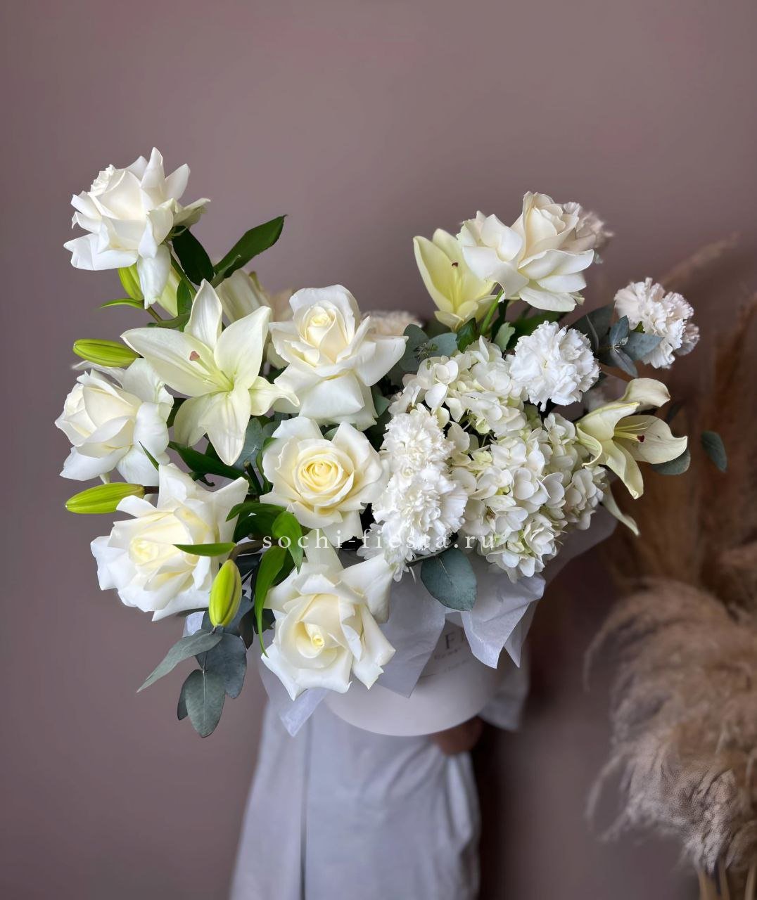 гортензия, кустовые розы, диантус, мисти баблс, эвкалипт, лента, цилиндр D16.
