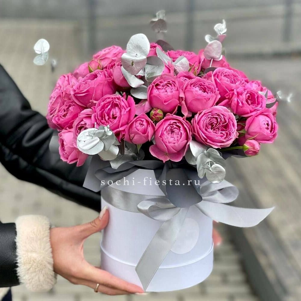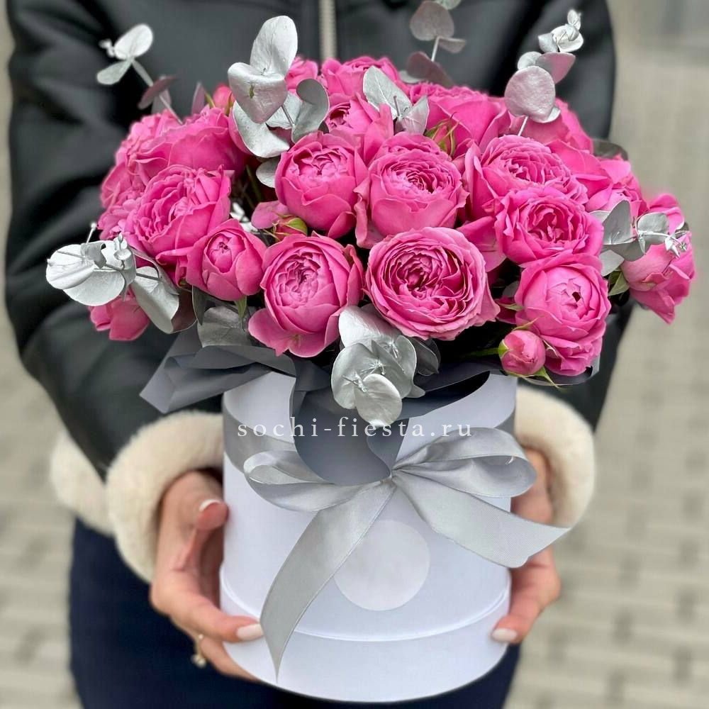 Кустовые розы собраны в плотную круглую форму и дополнены вертикальными стеблями вероники. Композиция в цилиндре выглядит графично и удерживает силуэт без дополнительных конструкций.