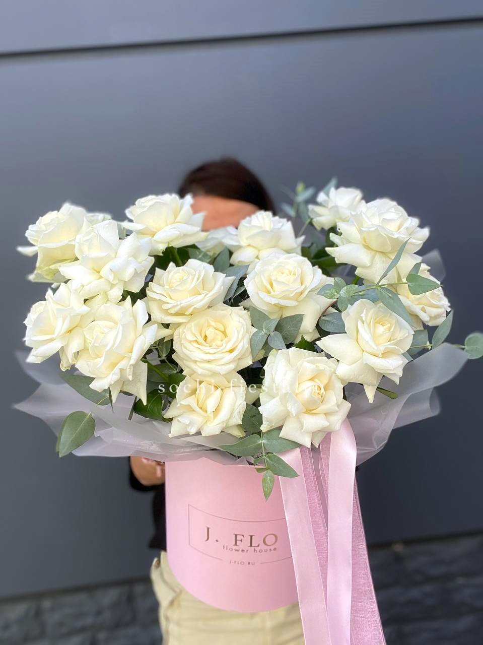 Семнадцать белых роз с раскрытыми лепестками собраны в круглый бокс с добавлением эвкалипта. Композиция держит форму и легко размещается на столе или комоде. Практичное решение для тех, кто ценит аккуратность и свежесть без лишних деталей.