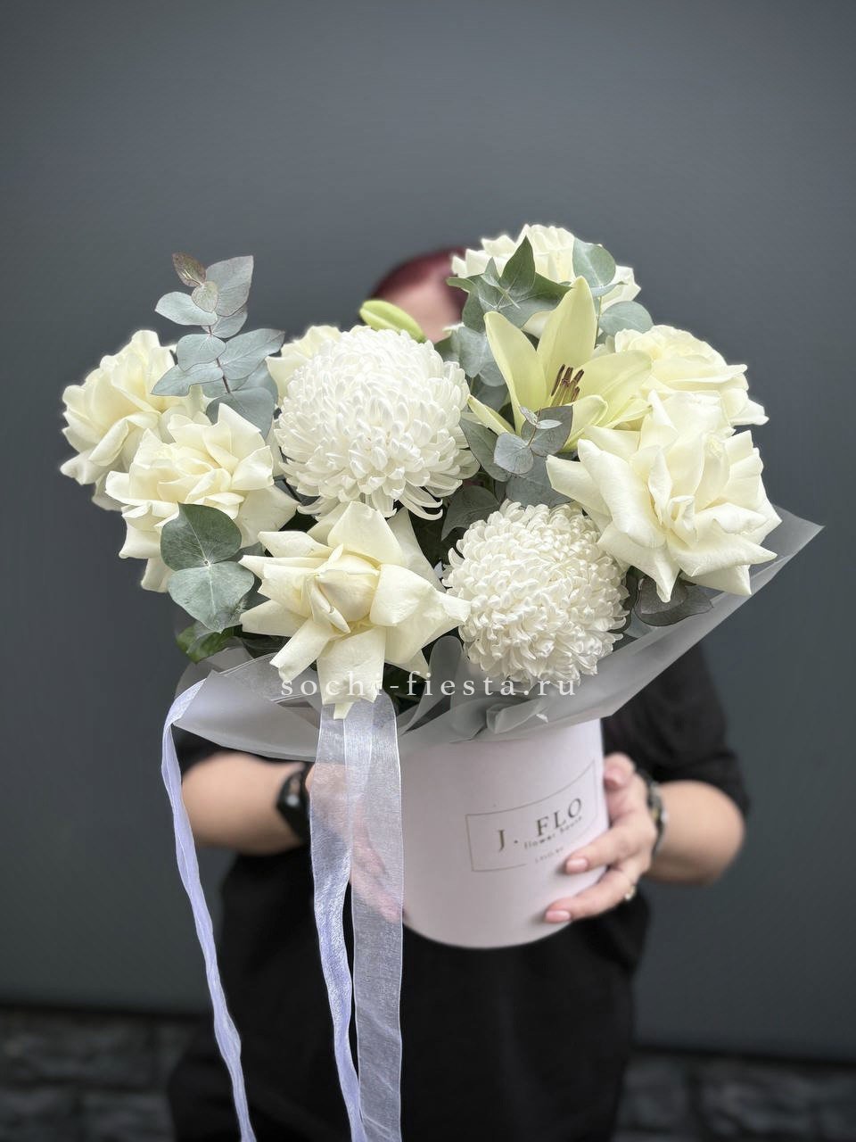 Воздушные соцветия мисти баблс собраны в компактную композицию с мягкими серо-зелеными оттенками. Миниатюрный эвкалипт добавляет свежести и завершает образ.