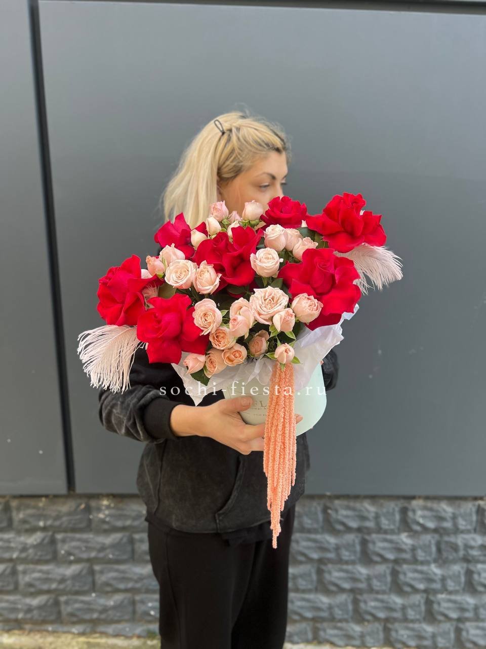 Масштабная композиция объединяет диантусы, антиринумы и розы разных сортов в единую структуру. Крупный бокс позволяет раскрыть каждый цветок в полную силу. Присутствие такой работы ощущается сразу.