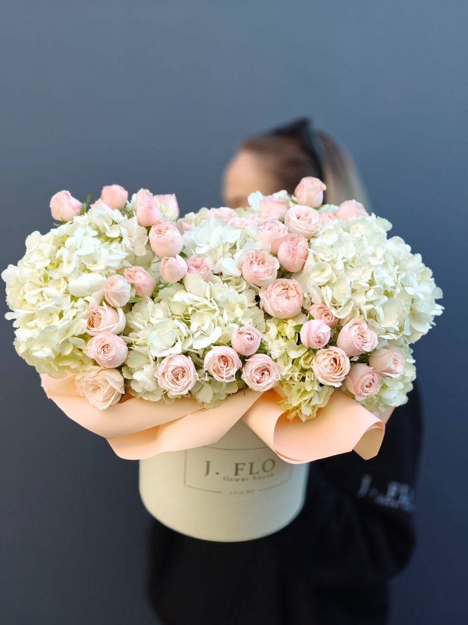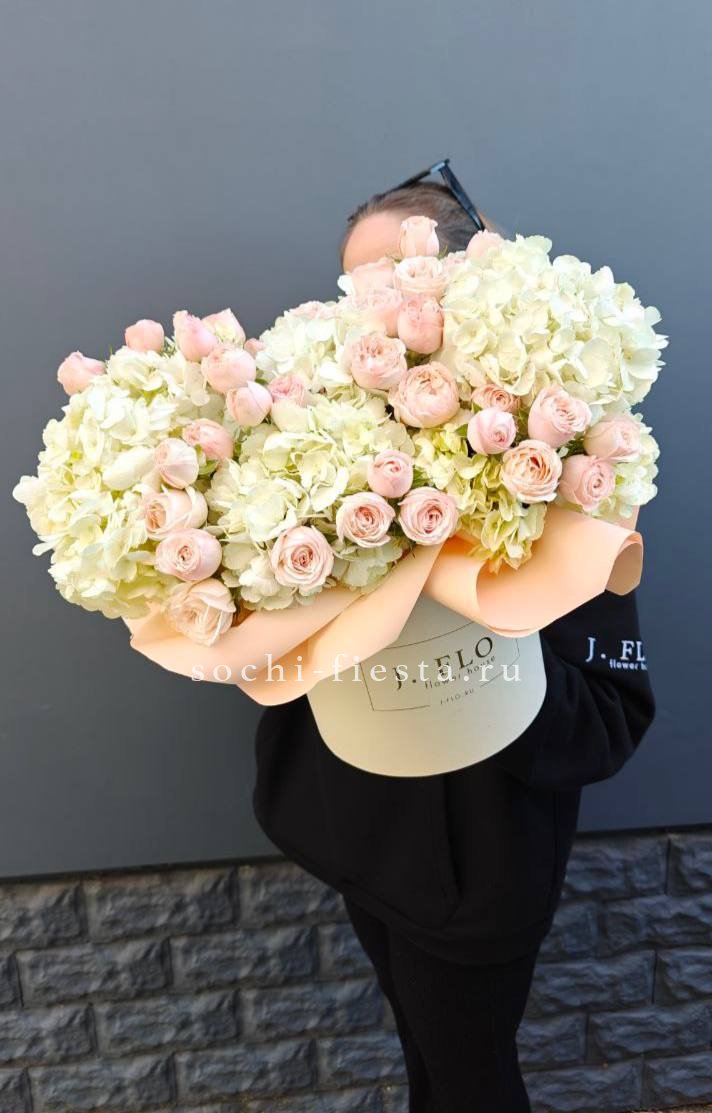 Розовая палитра переходит от французских роз к кустовым Джульетта с добавлением хлопка. Композиция в цилиндре сочетает воздушность и плотность фактур.