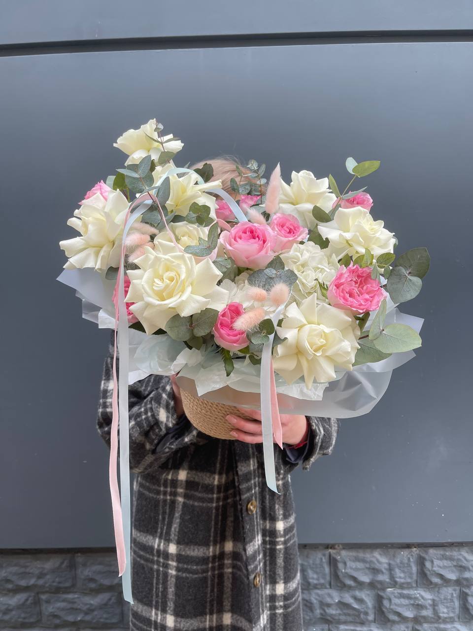 розовые розы, пионовидные кустовые, эустома, ранункулюс (возможна замена в зависимости от сезонности) в джутовом кашпо с элементами бус и перьев.