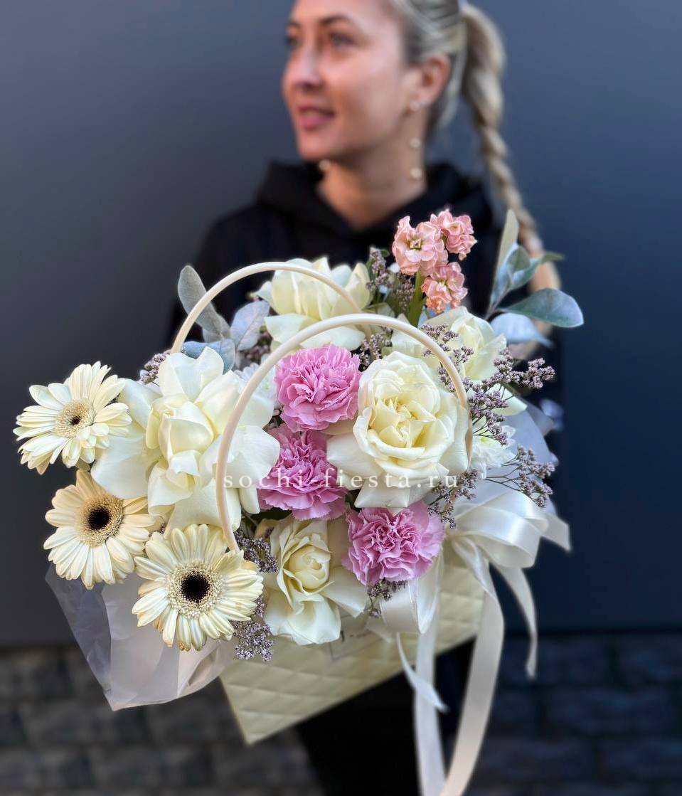 герберы , диантусы, белая роза, маттиола, хризантема кустовая, лента, сумка-кашпо.