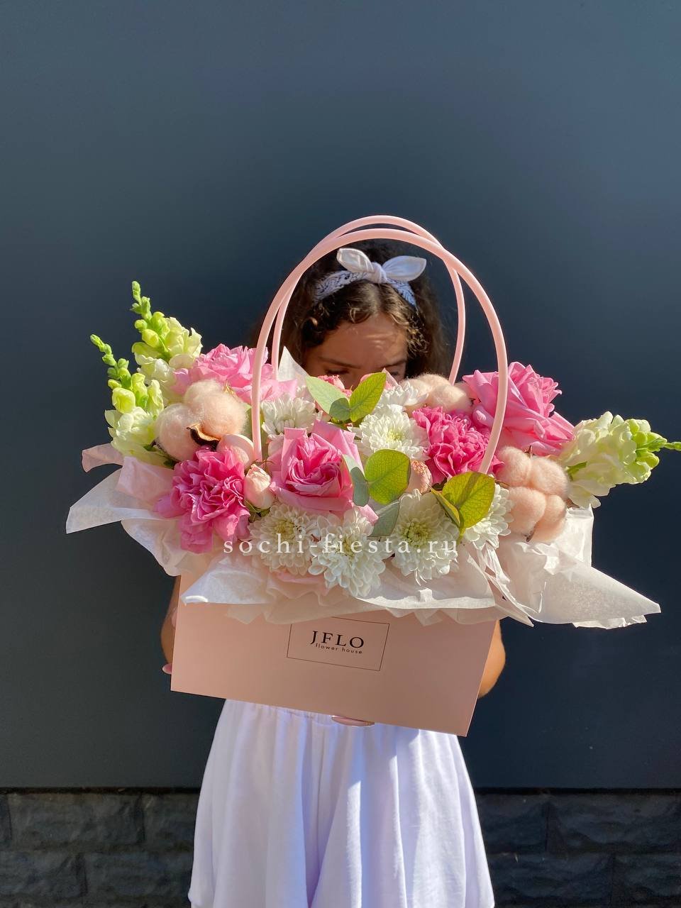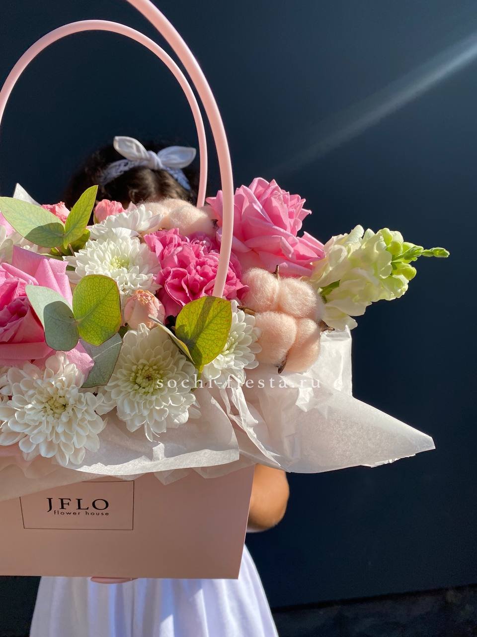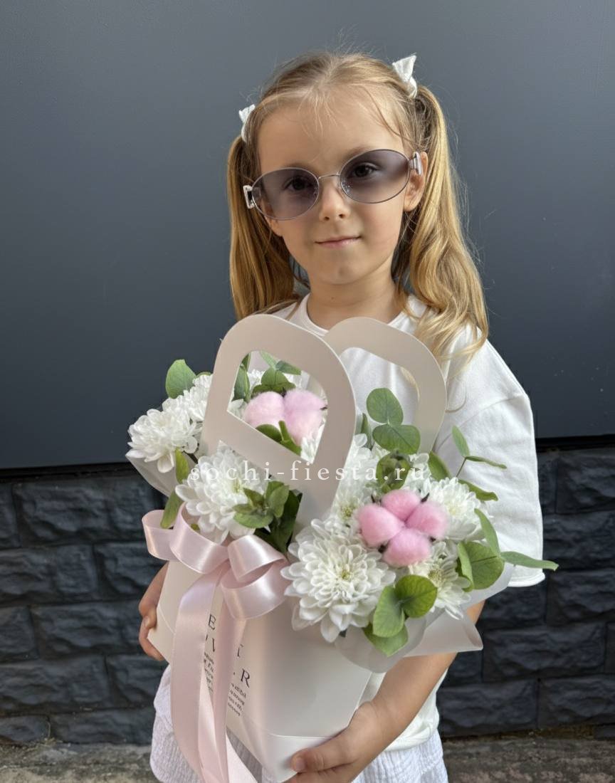 Хризантемы с пушистыми коробочками хлопка создают теплую домашнюю композицию в удобной сумочке. Цветы долго радуют взгляд и не требуют сложного ухода. Формат подходит для размещения в любом уголке дома.