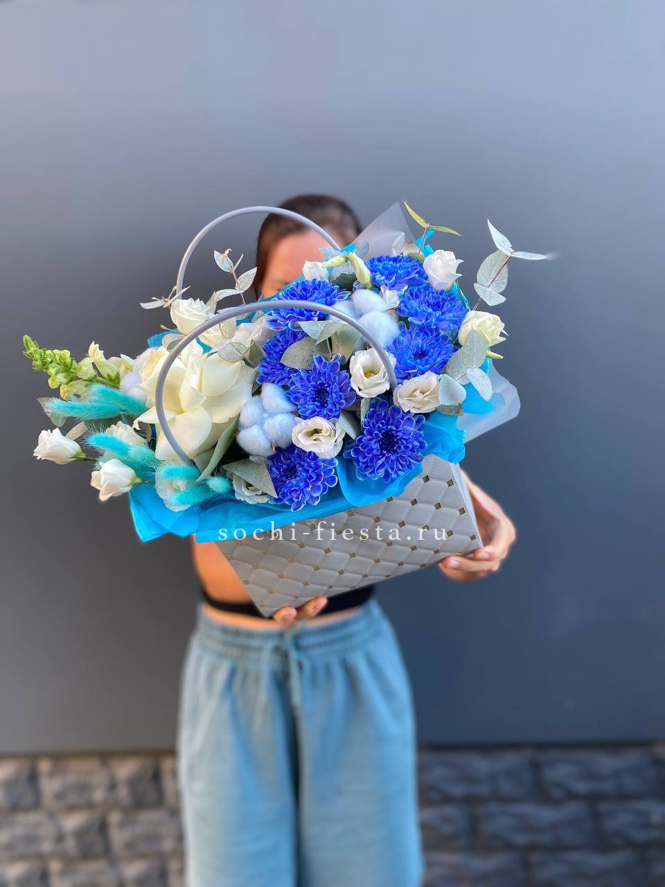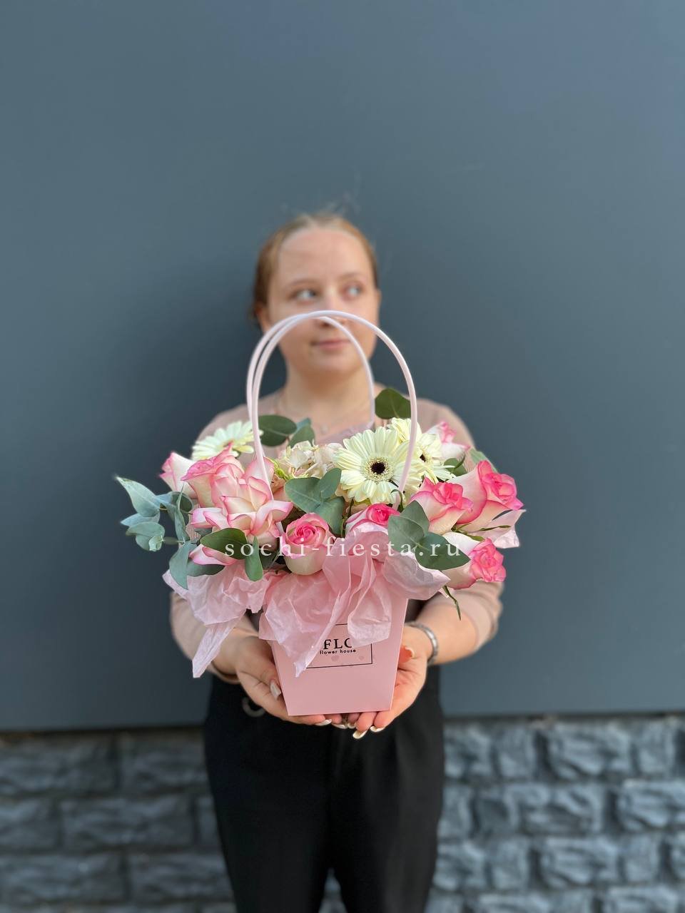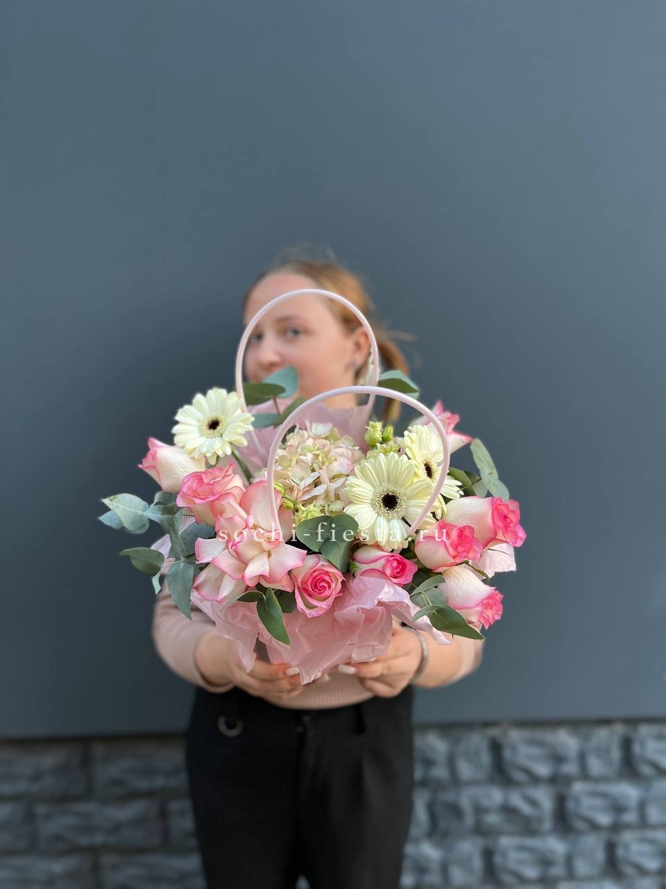 Розовые розы и диантусы переплетаются с кустовыми хризантемами в плотной округлой композиции. Альстромерия добавляет графичные акценты между бутонами. Сумочка собирает все элементы в аккуратную форму с естественным объёмом.