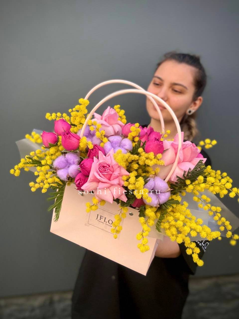 Розовые оттенки переплетаются с солнечными пушистыми шариками мимозы и белоснежным хлопком. Весенняя композиция в удобной сумочке дарит ощущение первых теплых дней и пробуждения природы.