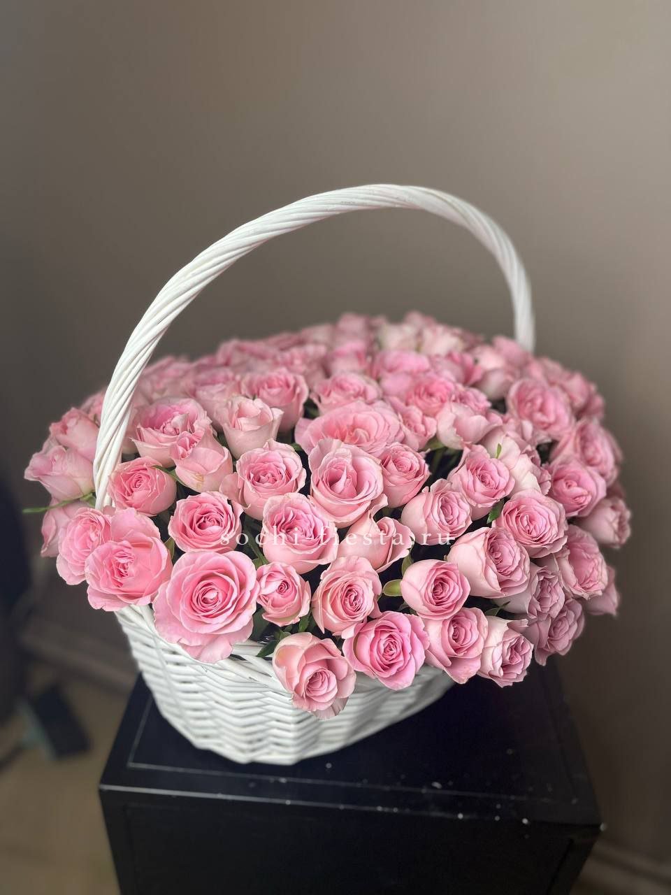 Плотная россыпь бутонов в плетеной корзине создает живописную композицию с переходами от сиреневых до пудровых оттенков. Гортензия и маттиола задают воздушный объем, а розы разной раскрытости добавляют глубину и многослойность всей картине.