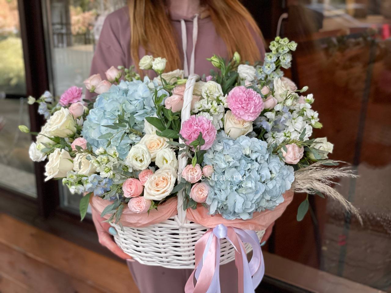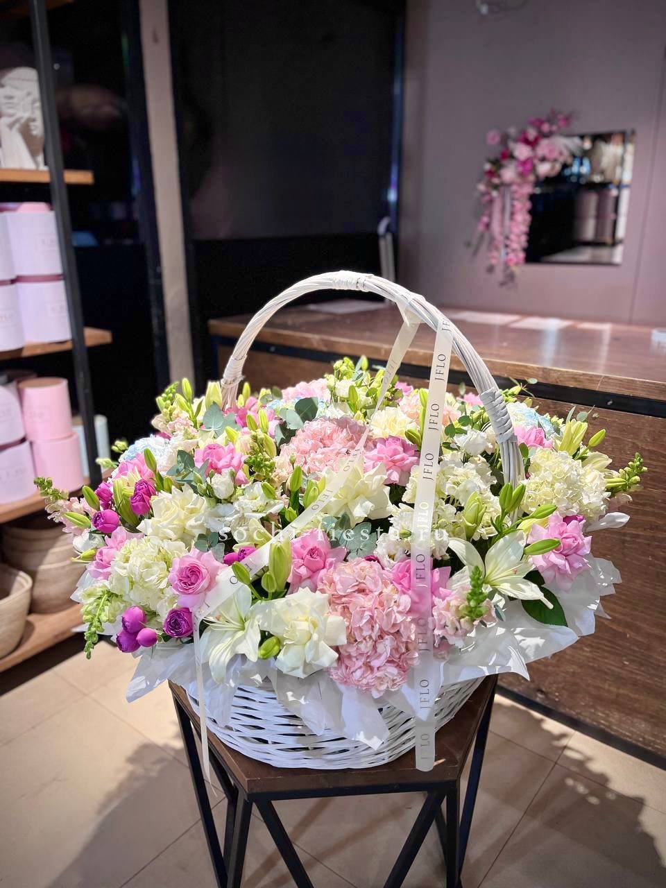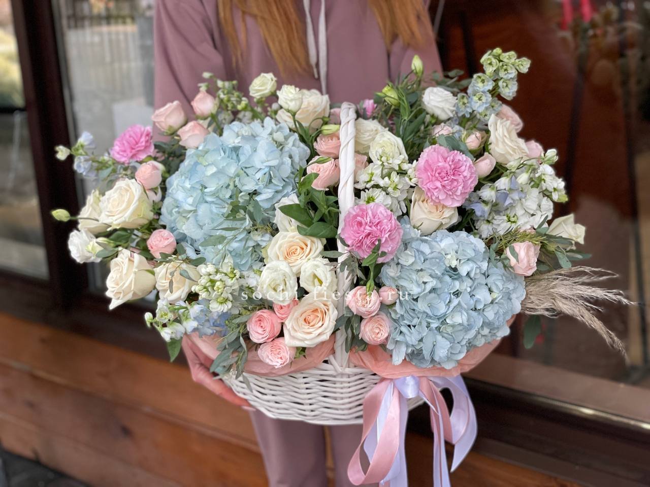 Плетёная корзина вмещает густую композицию из белых и розовых бутонов. Хризантемы и розы перемежаются с соцветиями гортензии, а статица добавляет воздушности между крупными головками цветов.