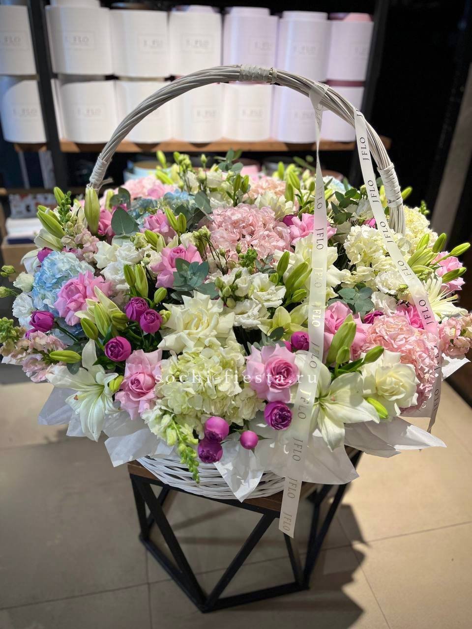 хризантема, кустовая роза, гортензия, белая роза, антиринум, статица, корзина средняя.